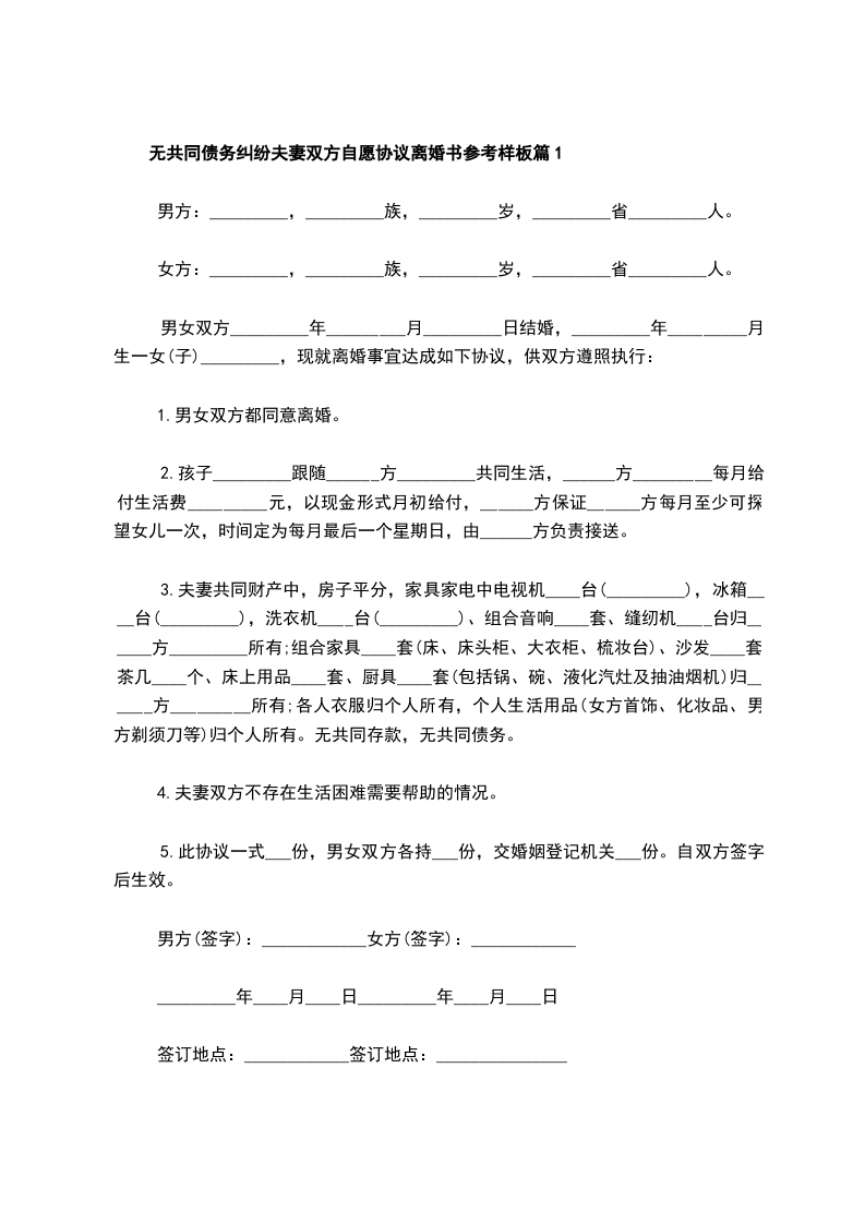 无共同债务纠纷夫妻双方自愿协议离婚书参考样板篇5