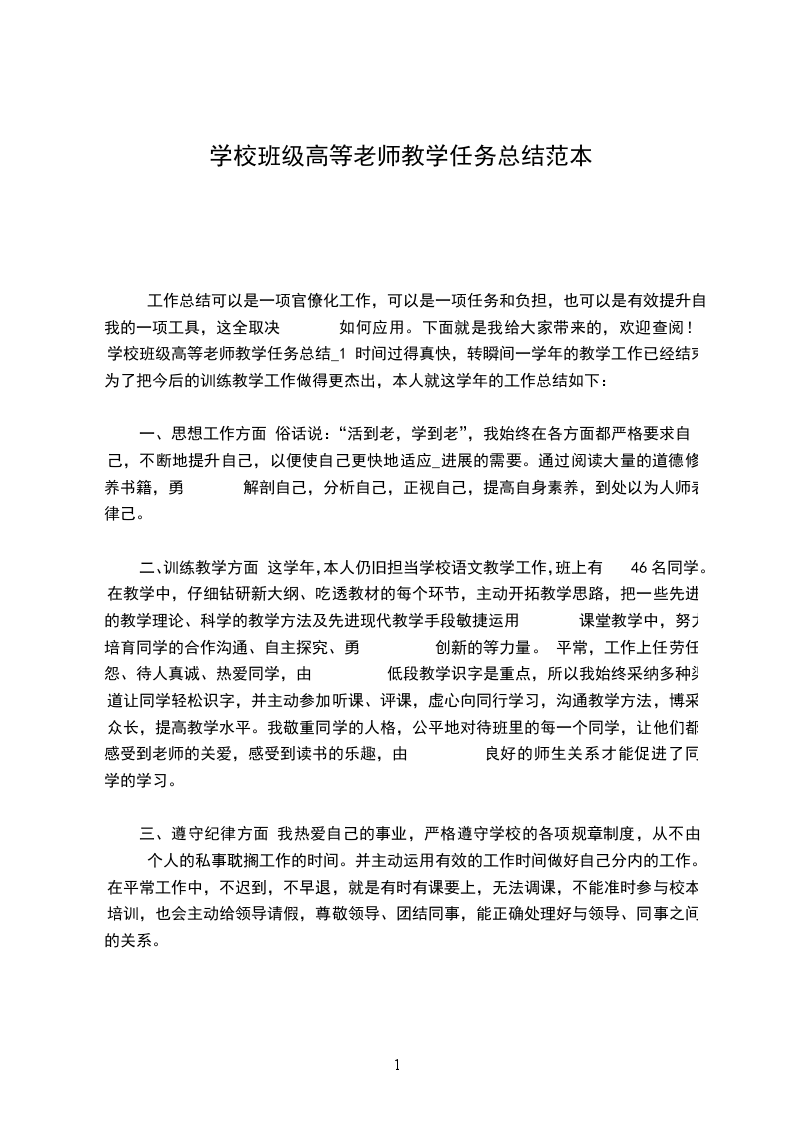 工作总结可以是一项官僚化工作,可以是一项任务和负担,也可以是有效提升自我的一项工具,这全取决 如何应用。下面就是我给大家带来的,欢迎查阅! 学校班级高等老师教学任务总结_1 时间过得真快,转瞬间一学年的教学工作已经结束,为了把今后的训练教学工作做得更杰出,本人就这学年的工作总结如下: