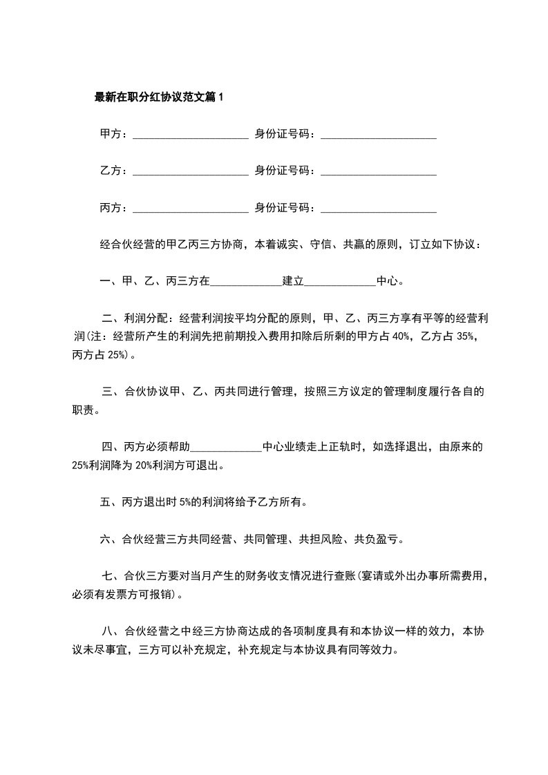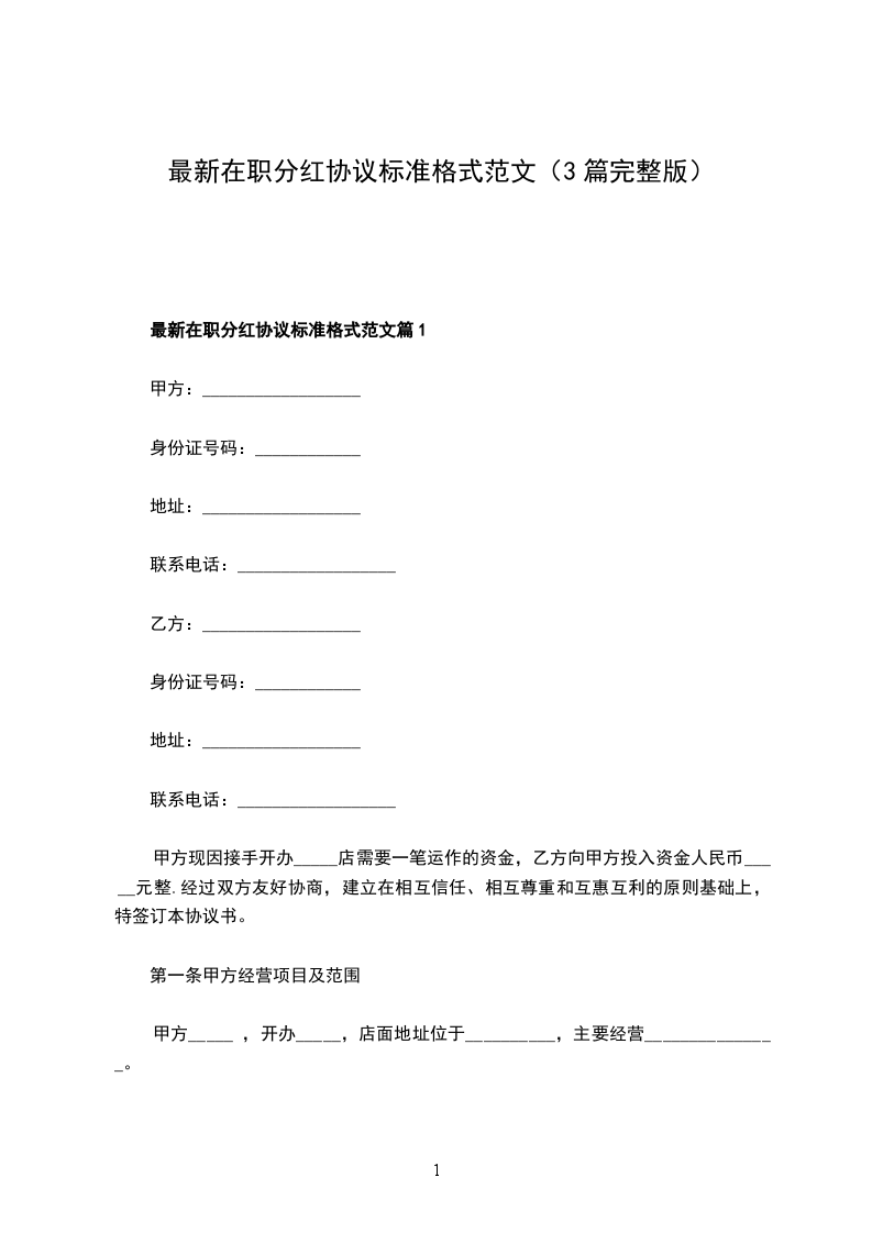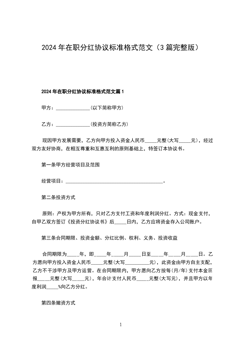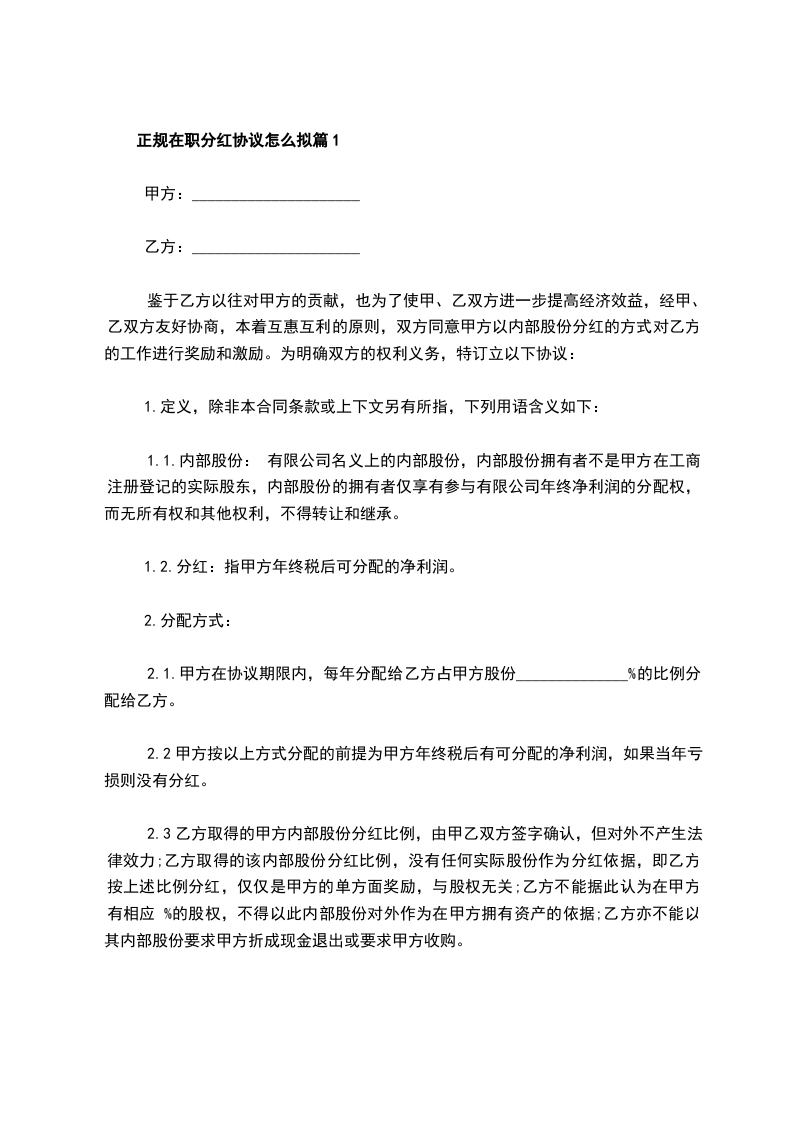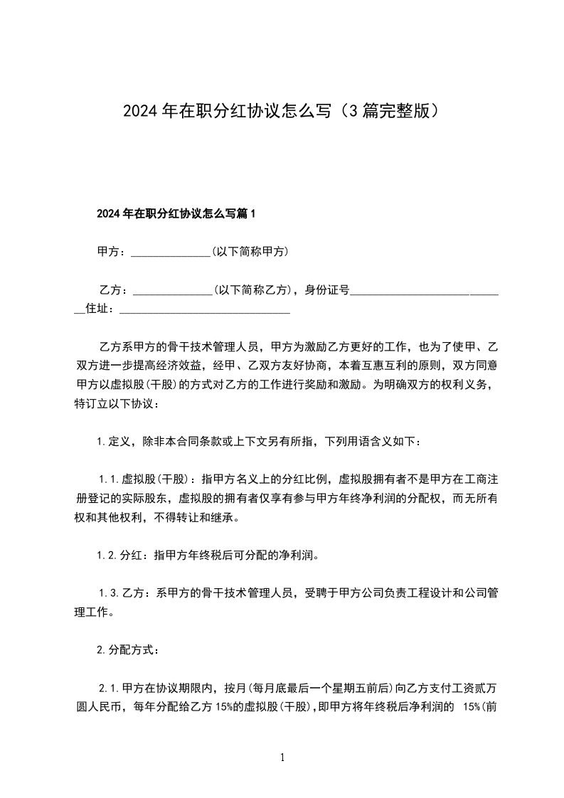 2024年在职分红协议怎么写篇1