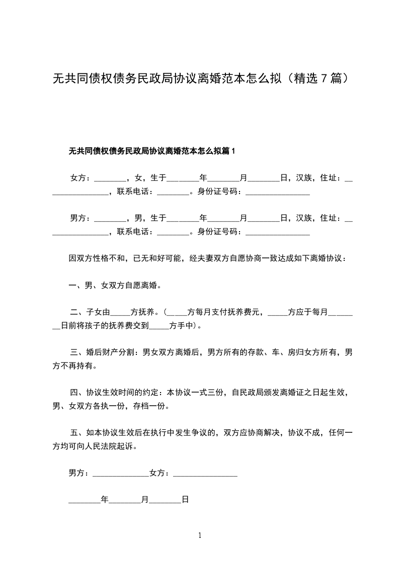无共同债权债务民政局协议离婚范本怎么拟篇7