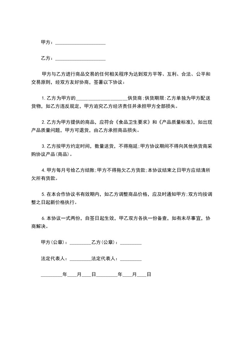 2.乙方为甲方提供的商品,应符合《食品卫生要求》和《产品质量标准》,如出现产品质量问题,甲方可退货,由乙方承担商品损失。