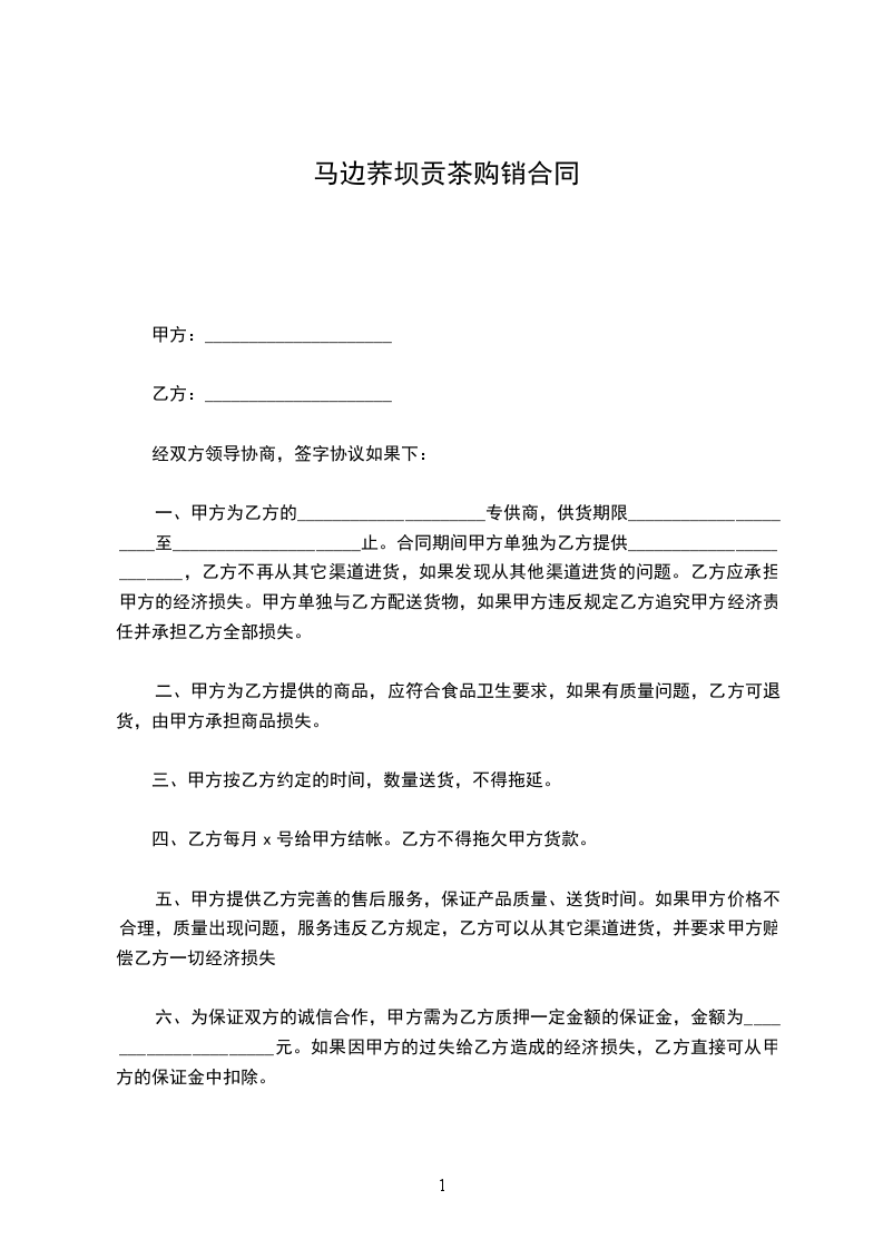 一、甲方为乙方的_____________________专供商,供货期限_____________________至_____________________止。合同期间甲方单独为乙方提供________________________,乙方不再从其它渠道进货,如果发现从其他渠道进货的问题。乙方应承担甲方的经济损失。甲方单独与乙方配送货物,如果甲方违反规定乙方追究甲方经济责任并承担乙方全部损失。