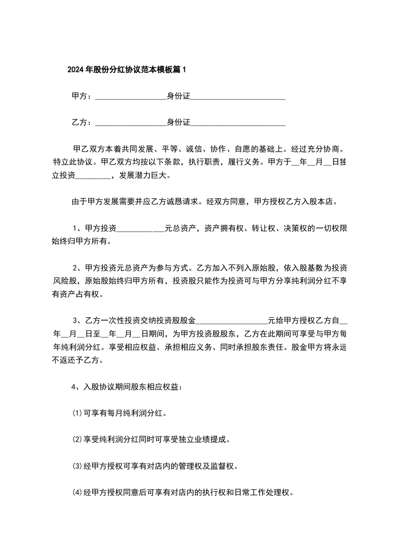 3、乙方一次性投资交纳投资股股金__________________元给甲方授权乙方自__年__月__日至__年__月__日期间,为甲方投资股股东,乙方在此期间可享受与甲方每年纯利润分红。享受相应权益、承担相应义务、同时承担股东责任。股金甲方将永远不返还予乙方。