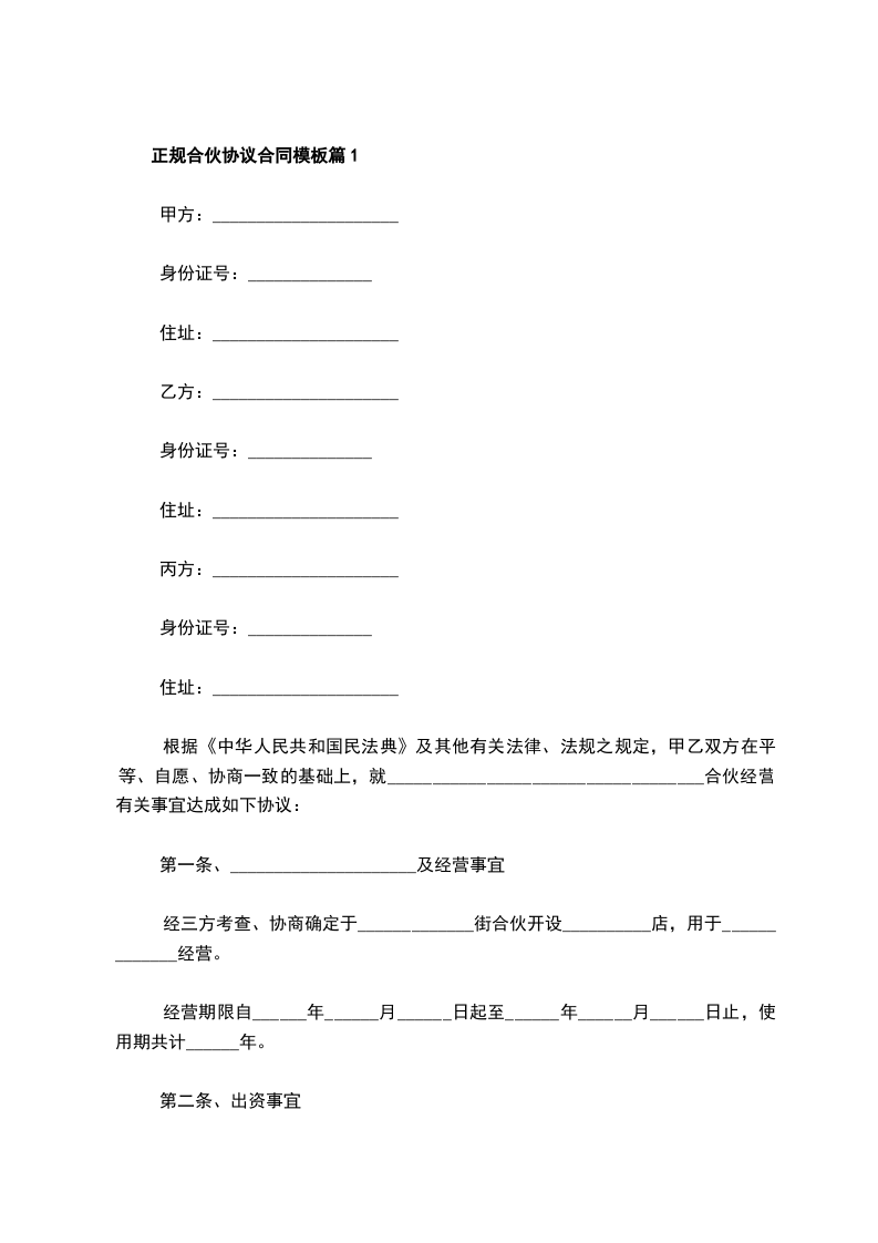正规合伙协议合同模板篇1