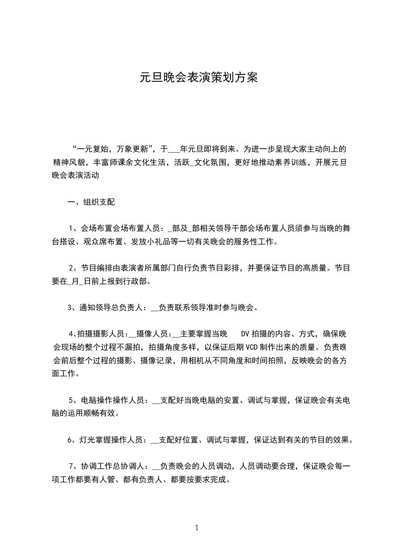 4、拍摄摄影人员:__摄像人员:__主要掌握当晚DV拍摄的内容、方式,确保晚会现场的整个过程不漏拍,拍摄角度多样,以保证后期VCD制作出来的质量。负责晚会前后整个过程的摄影、摄像记录,用相机从不同角度和时间拍照,反映晚会的各方面工作。