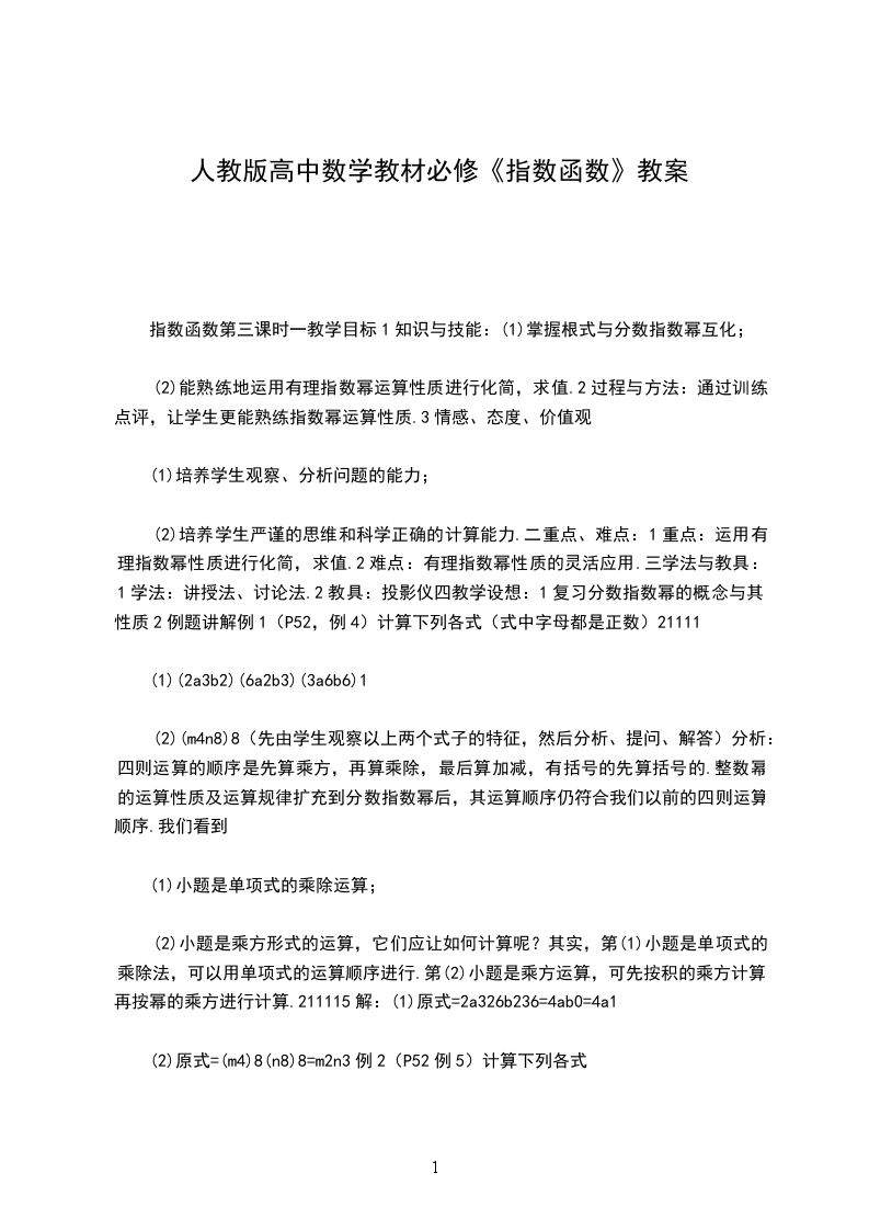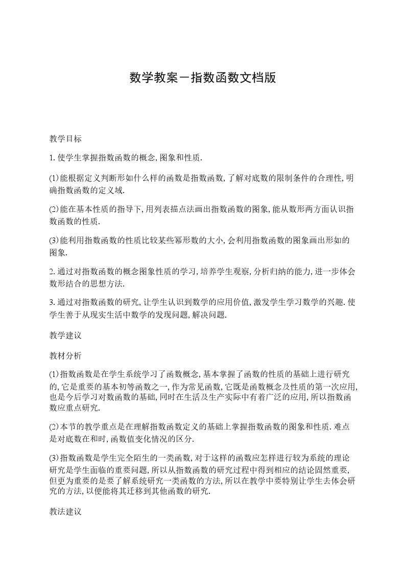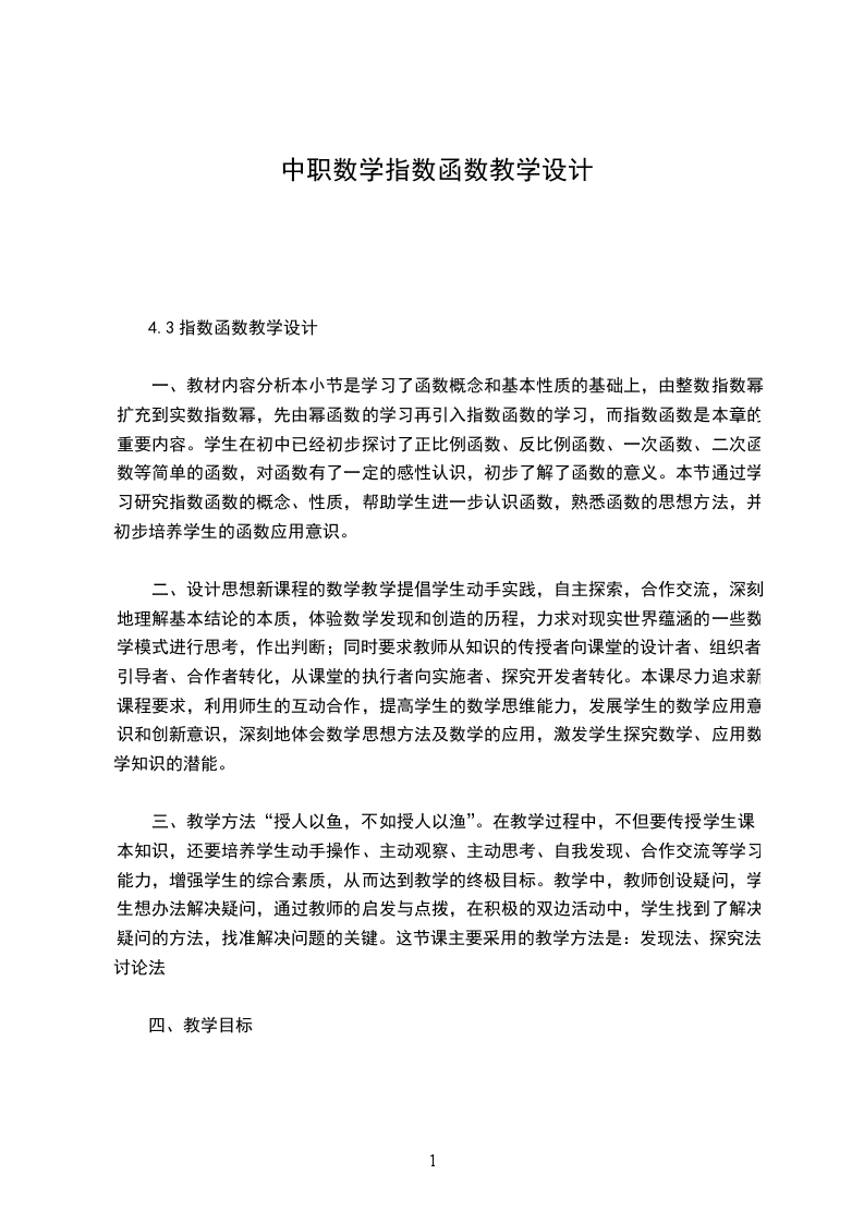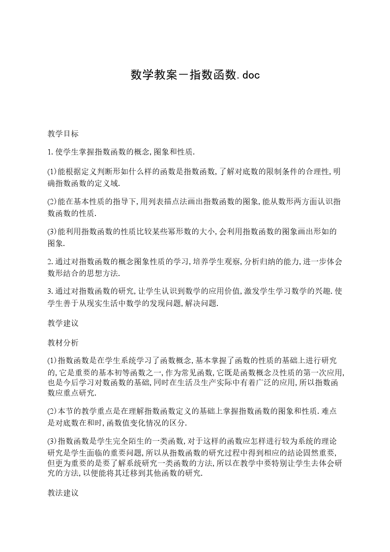 一、教材内容分析本小节是学习了函数概念和基本性质的基础上,由整数指数幂扩充到实数指数幂,先由幂函数的学习再引入指数函数的学习,而指数函数是本章的重要内容。学生在初中已经初步探讨了正比例函数、反比例函数、一次函数、二次函数等简单的函数,对函数有了一定的感性认识,初步了解了函数的意义。本节通过学习研究指数函数的概念、性质,帮助学生进一步认识函数,熟悉函数的思想方法,并初步培养学生的函数应用意识。