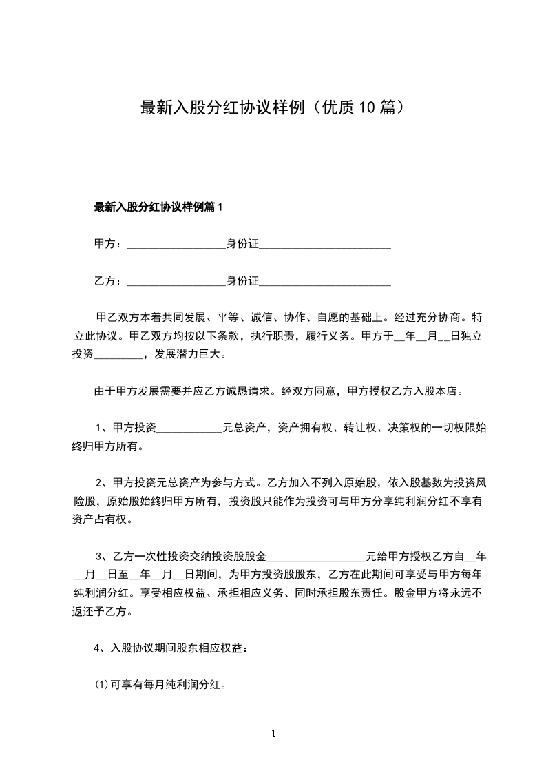 最新入股分红协议样例篇10
