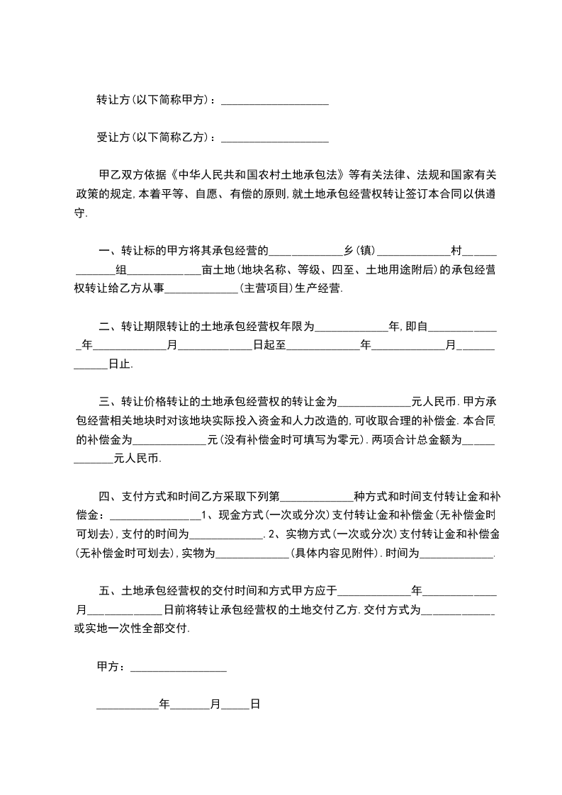 五、土地承包经营权的交付时间和方式甲方应于_____________年_____________月_____________日前将转让承包经营权的土地交付乙方.交付方式为_____________或实地一次性全部交付.