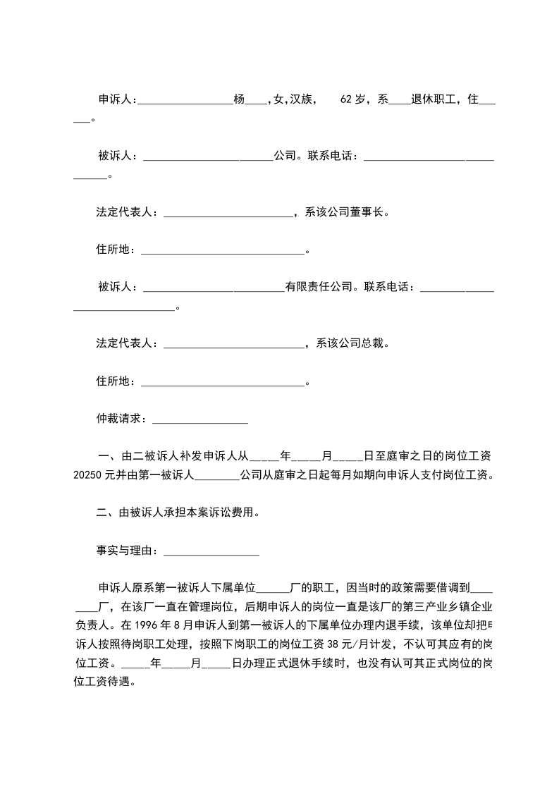 申诉人原系第一被诉人下属单位______厂的职工,因当时的政策需要借调到________厂,在该厂一直在管理岗位,后期申诉人的岗位一直是该厂的第三产业乡镇企业负责人。在1996年8月申诉人到第一被诉人的下属单位办理内退手续,该单位却把申诉人按照待岗职工处理,按照下岗职工的岗位工资38元/月计发,不认可其应有的岗位工资。_____年_____月_____日办理正式退休手续时,也没有认可其正式岗位的岗位工资待遇。