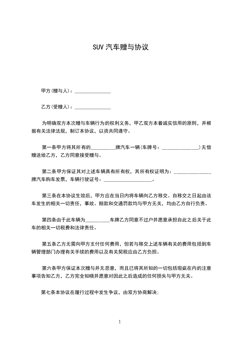 第一条甲方将其所有的__________牌汽车一辆(车牌号:_______________)无偿赠送给乙方,乙方同意接受赠与。