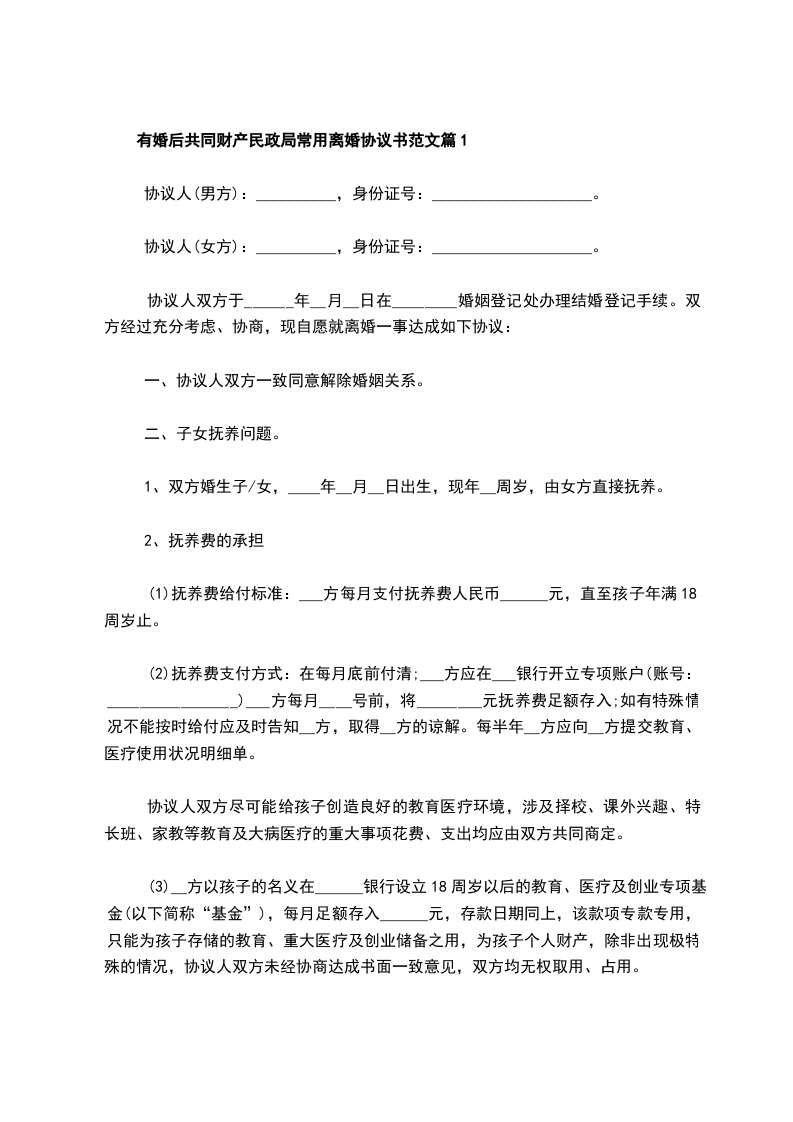 有婚后共同财产民政局常用协议离婚范本怎么写篇1