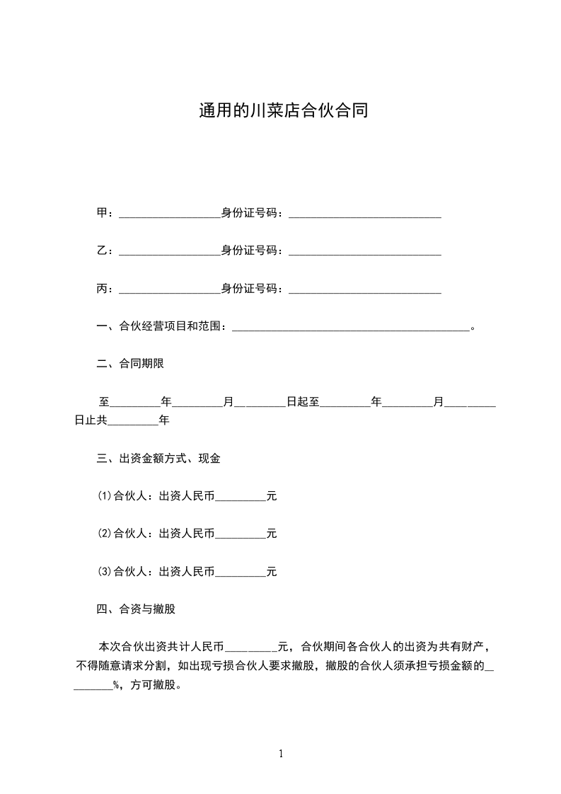 本次合伙出资共计人民币_________元,合伙期间各合伙人的出资为共有财产,不得随意请求分割,如出现亏损合伙人要求撤股,撤股的合伙人须承担亏损金额的_________%,方可撤股。