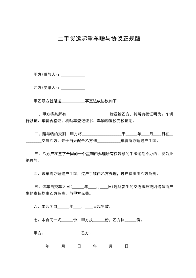 第一条甲方将其所有的__________牌汽车一辆(车牌号:_______________)无偿赠送给乙方,乙方同意接受赠与。