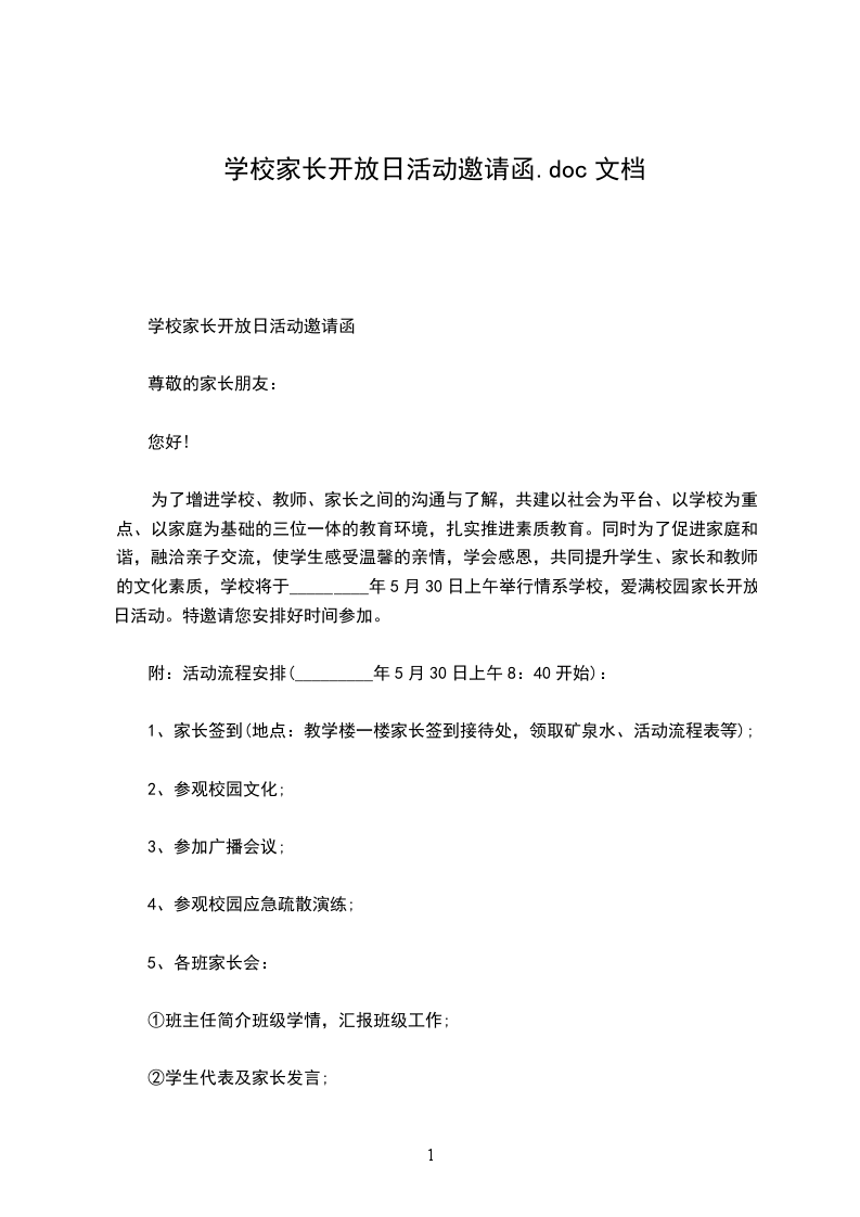 5.开放活动结束,请家长带孩子离园。 幼儿园 幼儿园家长开放日邀请函篇二 尊敬的各位家长: 为了使您更好地了解孩子在集体中的学习、生活状况,促进家园沟通,我们将开展温馨欢乐的家长开放日活动,盛情邀请您的参加。我们信任您很想知道孩子在园的每一个活动,每一个详情,在这次活动中,您肯定会被孩子的欢乐所感染,会为孩子的表现而喝彩,我们期盼着与您共同分享孩子的欢乐。 为了保证活动正常、有序地进行,烦请您配合做好以下事项: