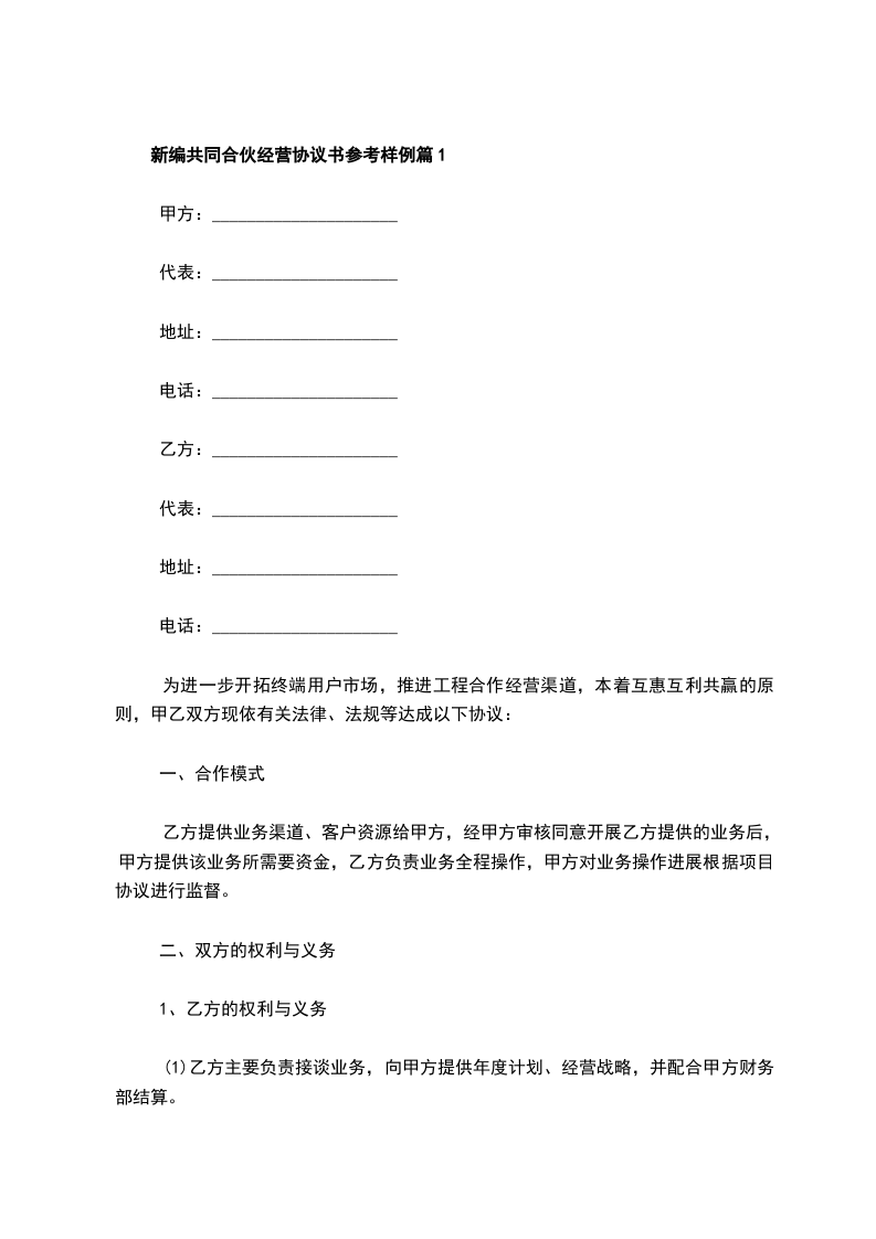 新编共同合伙经营协议书参考样例篇1