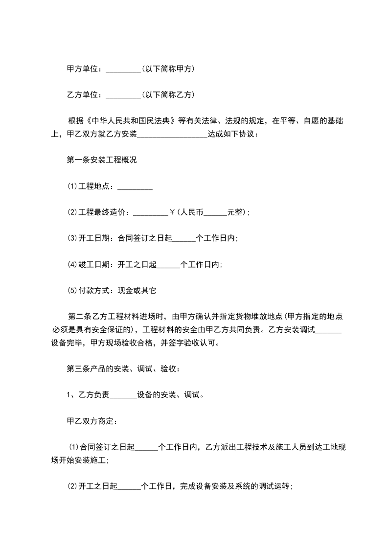 根据《中华人民共和国民法典》等有关法律、法规的规定,在平等、自愿的基础上,甲乙双方就乙方安装__________________达成如下协议: