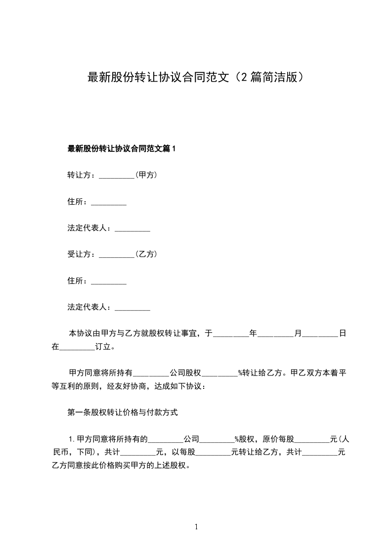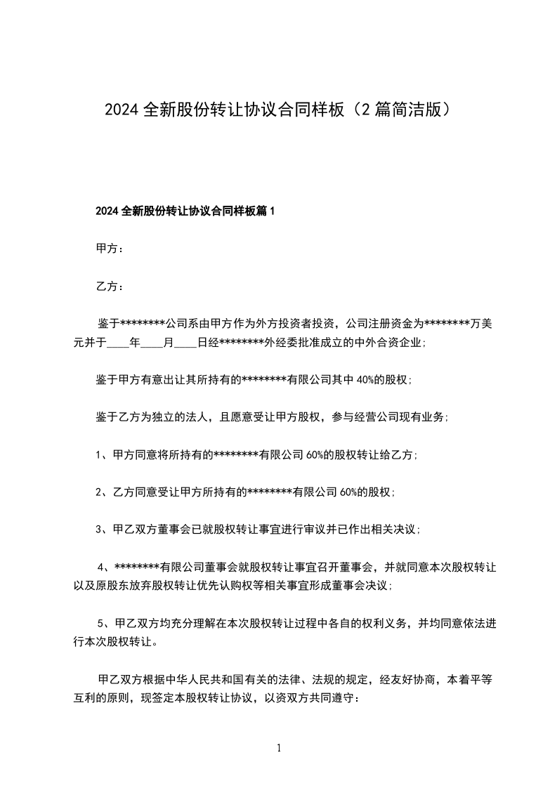 1、甲方将其持有该公司_____%的股权转让给乙方;