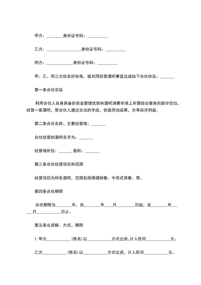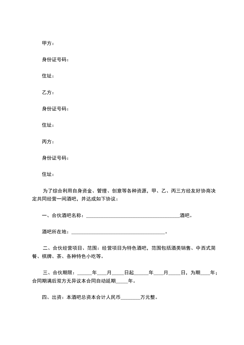 一、合伙酒吧名称:______________________________________酒吧。