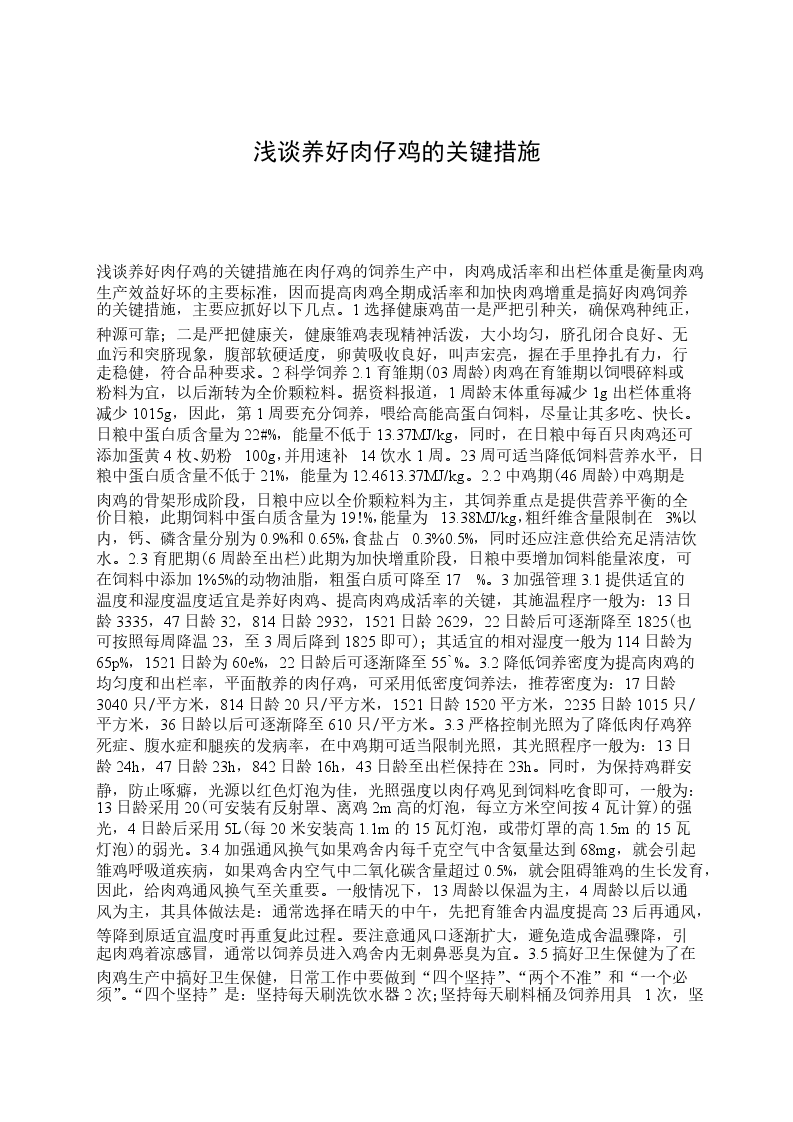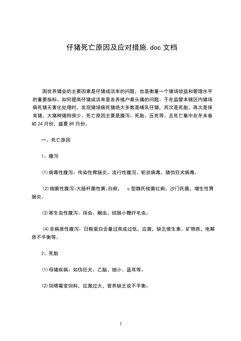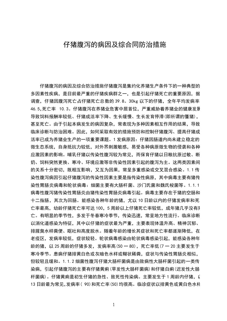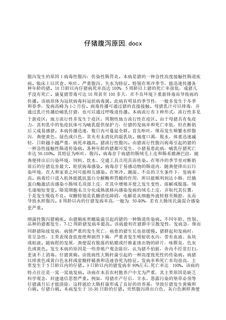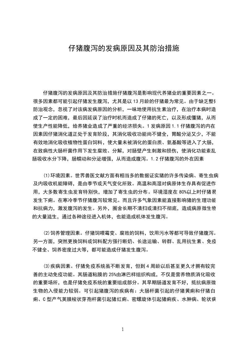 浅谈仔猪下痢的原因与防治措施仔猪下痢是消化道功能紊乱的一个综合症状,通常将粪中含水量高于80%的症状叫下痢(腹泻)。该病使仔猪的生长明显下降,单位增重的耗料率增加。在我国各大猪场,普遍存在仔猪下痢的现象,导致仔猪成活率降低,死亡率增加,增重差,饲料转化率下降,给养猪业带来巨大的经济损失。各种日龄的仔猪均可发生下痢,但多发生于3个阶段,即从出生到3日龄、714日龄和断奶后的一段时间内,仔猪下痢在各集中管理的猪场均可发生,不同猪场只是发病率和下痢的严重性不同而已。1引起仔猪下痢的原因仔猪下痢的原因是多方面的,现根据感染性和非感染性两种不同类型的下痢进行分析。1.1感染性下痢是指因病原微生物(细菌、病毒、寄生虫等)引起的下痢,其中因大肠杆菌引起的下痢最为常见。1.1.1大肠杆菌感染动物体在正常情况下即携带该菌,但不发病,当机体受不良外界环境刺激、消化道功能紊乱、肠道菌群失调后,大肠杆菌乘机繁殖,产生致病作用。大肠杆菌感染可引起仔猪白痢病、仔猪黄痢病和水肿病。仔猪白痢以仔猪排出具有特殊气味的乳白色、灰白色或青白色糊状软便为特征,有时可见吐奶。仔猪黄痢以仔猪排出带有腥臭味和黄色糊状软便或黄色半透明稀便为特征。仔猪的黄白痢均发生于小日龄仔猪。在美国伊利诺斯州做的调查分析表明,从16日龄仔猪分离到的病原性大肠杆菌的比例为53%,远远高于7日龄至断奶阶段分离到的比例(14%)。猪水肿病又称胃肠水肿,是断奶前后仔猪的一种急性散发性疾病,主要表现为突然发病,共济失调,惊厥,局部或全身麻痹及头部水肿,特别是健壮的猪易发此病。1.1.2传染性胃肠炎和猪流行性腹泻这两种病在临床上难以区别,如要准确加以鉴别,需做免疫学试验。传染性胃肠炎是由冠状病毒引起的,而猪流行性腹泻是由类冠状病毒引起的,各龄猪均可发生,仔猪发病较为严重,中大猪、成年猪发病率低,尤其在冬春季,仔猪饲养比较密集的猪场均发生,死亡率(50%)和发病率均较高,给养猪业带来致命打击。仔猪患病后的典型临床症状为突然发生呕吐,急剧的水样腹泻、粪水呈黄色、淡绿或灰白色,内含未消化的凝乳块,体温稍高或无变化,病猪迅速脱水,体重下降,精神萎靡,皮毛粗乱无光,吸吮能力降低甚至停止吸奶,战栗、食欲减退或厌食,感染后1224h发病,25日龄死亡,一周龄以下的仔猪死亡率高达50%,病愈后的仔猪增重缓慢,生长发育滞后,甚至成为无养殖价值的小僵猪。其次还有猪轮状病毒病,仔猪感染后会排出糊状黄白或暗灰色的稀便,发病率为800%,死亡率50%以上,如果同时继发细菌感染,死亡率会大大增加。1.1.3球虫病球虫病在现代化的猪场,尤其在高密度集中地面或板条上饲养的猪场发病较为严重,一般710月份发病率较高,614日龄仔猪均易感染,临床症状为排出黄褐色或灰色糊状粪便,12d后变成水样稀便,并很快脱水死亡。孢子球虫对猪危害最大。成年猪是球虫病源的携带者,它们具有免疫力而不发病,但可周期性的排出卵来污染环境,感染仔猪。1.2非感染性下痢1.2.1饲料方面原因随着饲料的高度集约化、对配合饲料的科学性要求越来越高,如果饲料配比不当或饲料不卫生也常造成仔猪下痢。总结起来有以下几点。1.2.1.1母猪日粮蛋白质过高引起仔猪下痢。仔猪饲料的蛋白质水平主要取决于饲料的能量水平及饲料原料营养素的消化率,由于我国饲料原料中动物蛋白饲料的局限性,加上饲养管理水平的限制,因而饲料中的蛋白质水平不可过高,否则可造成仔猪营养性下痢现象。在实际生产过程中,当仔猪饲料中豆粕等植物性蛋白质饲料所占比例大于20,常可引起仔猪下痢。1.2.1.2仔猪饲料存在抗营养因子,如抗胰蛋白酶因子单子、植酸、-淀粉酶抑制因子和植酸凝血素等易引起仔猪消化不良导致下痢。这些抗营养因子主要存在于加工不当的植物原料中。1.2.1.3饲料中含有未经膨化的植物性蛋白、易产生抗原,诱发下痢。1.2.1.4仔猪缺铁性贫血,也可引起下痢。铁具有生理防御机能,转铁蛋白除运转铁以外,还有预防机体感染疾病的作用,乳汁或白细胞中的乳铁蛋白在肠道能把游离铁离子结合成复合物,阻止大肠杆菌利用,有利于乳酸杆菌利用,对预防新生动物腹泻具有重要意义。有资料表明,给初生仔猪注射或口服补铁物质可提高仔猪免疫力。1.2.1.5饲料酸败或腐败变质。饲料来源不明,储藏不当,不卫生或过期使饲料含有黄曲霉、细菌、病毒等毒素。1.2.1.6饲料含盐过高。1.2.1.7饲料pH值不合理(应控制在5.86.4之间较为合理)。断奶后的仔猪,由于母乳来源的停止和胃内盐酸的分泌机能尚未健全、造成胃内pH升高,导致消化道内菌落失衡以及消化酶活性改变,从而降低了饲料蛋白质的消化率,导致下痢出现。目前早期断奶仔猪下痢原因还有一种新观点,认为仔猪对日粮中的抗原物质产生过敏而诱发下痢也是一个重要的原发性因素。1.2.2猪场卫生条件差,如猪舍中猪粪没有彻底扫干净,旧猪舍未经彻底消毒和清洗,就用来饲养仔猪,在同一猪舍内将不同日龄猪只进行混养;猪舍内的温度、湿度不合理、通风不良;防疫制度不健全,没有采用全进全出制。2仔猪下痢的防治仔猪发病后,应及时进行药物治疗,主要治疗原则是找出病因对症下药。如果是细菌性的,应做药敏试验,投给抗生素药物,也可用大蒜等中药治疗,如果治疗效果不明显,说明可
