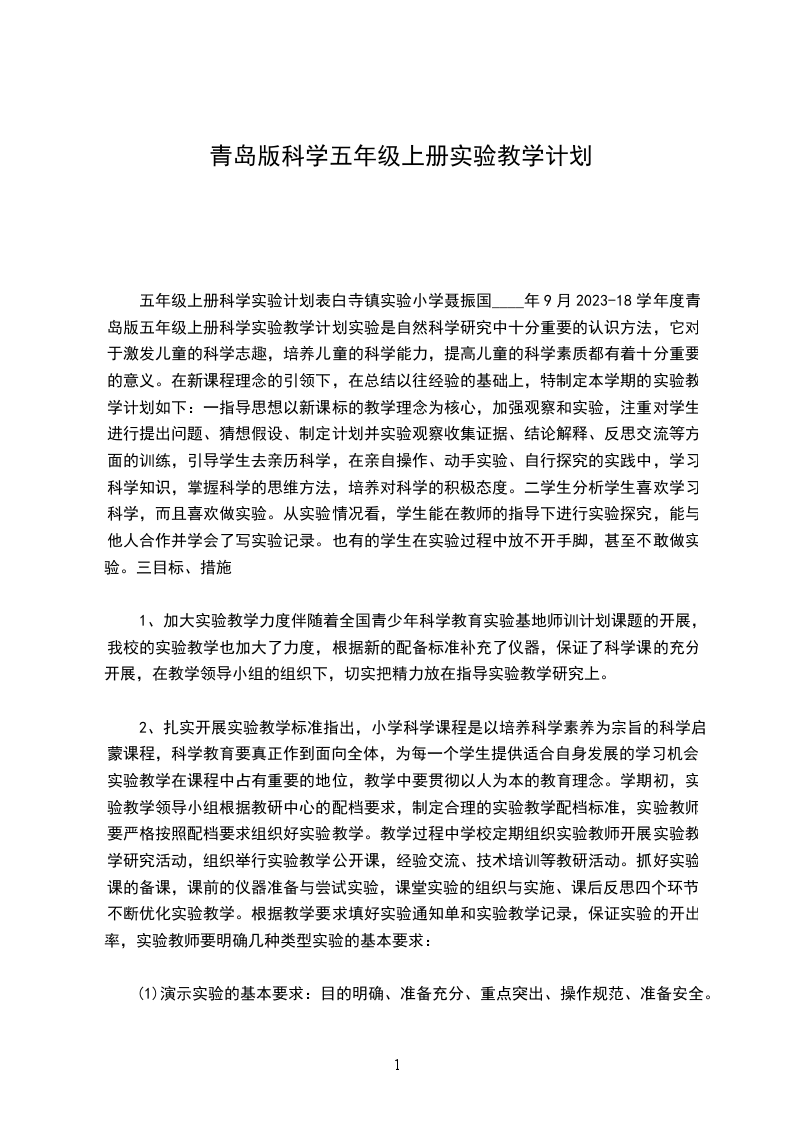 五年级上册科学实验计划表白寺镇实验小学聂振国____年9月2024-18学年度青岛版五年级上册科学实验教学计划实验是自然科学研究中十分重要的认识方法,它对于激发儿童的科学志趣,培养儿童的科学能力,提高儿童的科学素质都有着十分重要的意义。在新课程理念的引领下,在总结以往经验的基础上,特制定本学期的实验教学计划如下:一指导思想以新课标的教学理念为核心,加强观察和实验,注重对学生进行提出问题、猜想假设、制定计划并实验观察收集证据、结论解释、反思交流等方面的训练,引导学生去亲历科学,在亲自操作、动手实验、自行探究的实践中,学习科学知识,掌握科学的思维方法,培养对科学的积极态度。二学生分析学生喜欢学习科学,而且喜欢做实验。从实验情况看,学生能在教师的指导下进行实验探究,能与他人合作并学会了写实验记录。也有的学生在实验过程中放不开手脚,甚至不敢做实验。三目标、措施