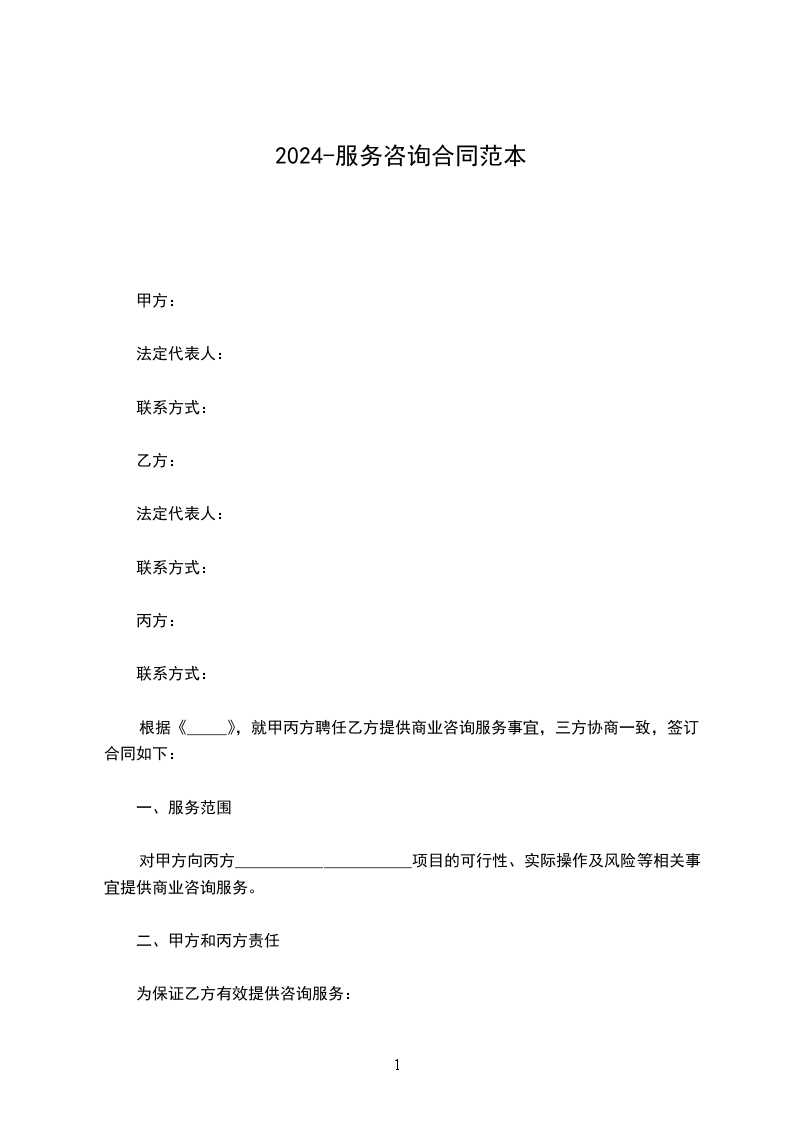 根据《_____》,就甲丙方聘任乙方提供商业咨询服务事宜,三方协商一致,签订合同如下: