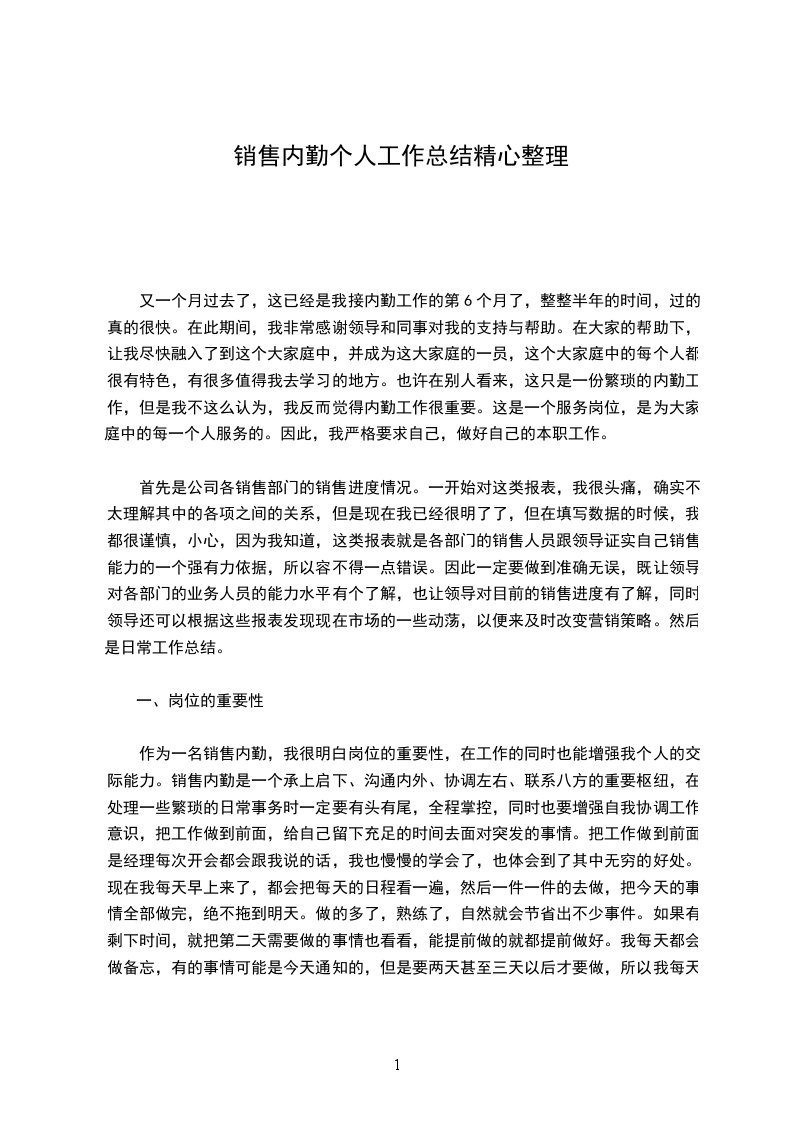 一、日常工作在工作的过程中常常会遇到诸多的问题,当遇到这些问题没能准时处理好且没上报时,给公司带来了没必要的损失,个人感觉非常内疚。经过大半年的工作,深知岗位的重要性,也能增加我个人的交际本领,为此非常感觉公司能给我这次机会。销售内勤是承上启下、沟通内外、协调左右、联系的重要岗位。在处理一些日常事务,要有头有尾,自我增加协调工作意识,这半年来基本上做到了事事有着落。