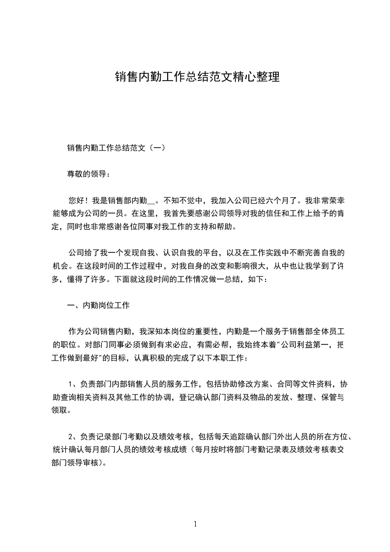 一、以踏实的工作看法,适应销售内勤工作 作为公司的销售内勤,我深知岗位的重要性,也能增加我个人的交际本领。销售部内勤是一个承上启下、沟通内外、协调左右、联系八方的重要枢纽,把握市场购机客户资料、竞争对手信息、产品信息等的搜索、整理、备案、反馈为销售部业务人员做好保障。在一些文件的整理、买卖合同的签署、招投标文件的修改、用户的回款进度等等都是一些有益的决策文件,应对这些繁琐的日常事务,要有头有尾,自我增加协调工作意识,这一年来基本上做到了事事有着落。