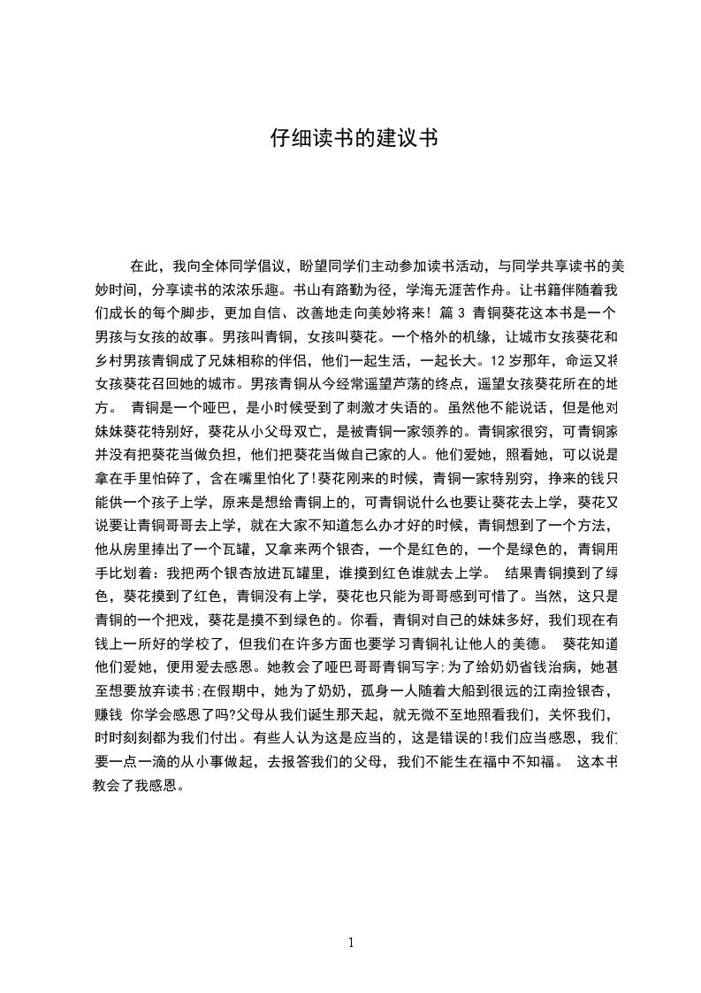在此,我向全体同学倡议,盼望同学们主动参加读书活动,与同学共享读书的美妙时间,分享读书的浓浓乐趣。书山有路勤为径,学海无涯苦作舟。让书籍伴随着我们成长的每个脚步,更加自信、改善地走向美妙将来! 篇3 青铜葵花这本书是一个男孩与女孩的故事。男孩叫青铜,女孩叫葵花。一个格外的机缘,让城市女孩葵花和乡村男孩青铜成了兄妹相称的伴侣,他们一起生活,一起长大。12岁那年,命运又将女孩葵花召回她的城市。男孩青铜从今经常遥望芦荡的终点,遥望女孩葵花所在的地方。 青铜是一个哑巴,是小时候受到了刺激才失语的。虽然他不能说话,但是他对妹妹葵花特别好,葵花从小父母双亡,是被青铜一家领养的。青铜家很穷,可青铜家并没有把葵花当做负担,他们把葵花当做自己家的人。他们爱她,照看她,可以说是拿在手里怕碎了,含在嘴里怕化了!葵花刚来的时候,青铜一家特别穷,挣来的钱只能供一个孩子上学,原来是想给青铜上的,可青铜说什么也要让葵花去上学,葵花又说要让青铜哥哥去上学,就在大家不知道怎么办才好的时候,青铜想到了一个方法,他从房里捧出了一个瓦罐,又拿来两个银杏,一个是红色的,一个是绿色的,青铜用手比划着:我把两个银杏放进瓦罐里,谁摸到红色谁就去上学。 结果青铜摸到了绿色,葵花摸到了红色,青铜没有上学,葵花也只能为哥哥感到可惜了。当然,这只是青铜的一个把戏,葵花是摸不到绿色的。你看,青铜对自己的妹妹多好,我们现在有钱上一所好的学校了,但我们在许多方面也要学习青铜礼让他人的美德。 葵花知道他们爱她,便用爱去感恩。她教会了哑巴哥哥青铜写字;为了给奶奶省钱治病,她甚至想要放弃读书;在假期中,她为了奶奶,孤身一人随着大船到很远的江南捡银杏,赚钱 你学会感恩了吗?父母从我们诞生那天起,就无微不至地照看我们,关怀我们,时时刻刻都为我们付出。有些人认为这是应当的,这是错误的!我们应当感恩,我们要一点一滴的从小事做起,去报答我们的父母,我们不能生在福中不知福。 这本书教会了我感恩。