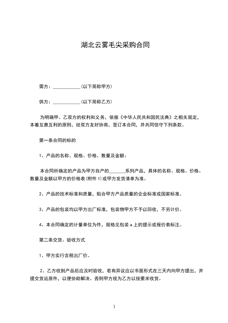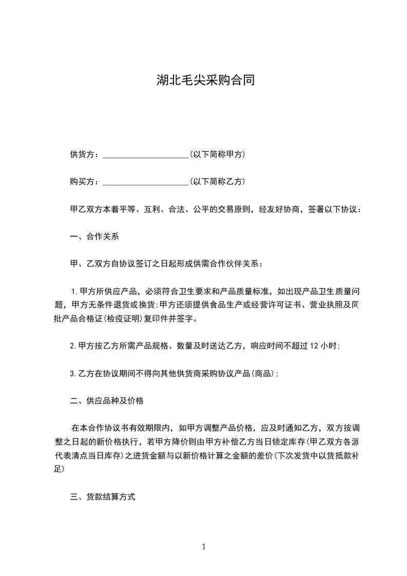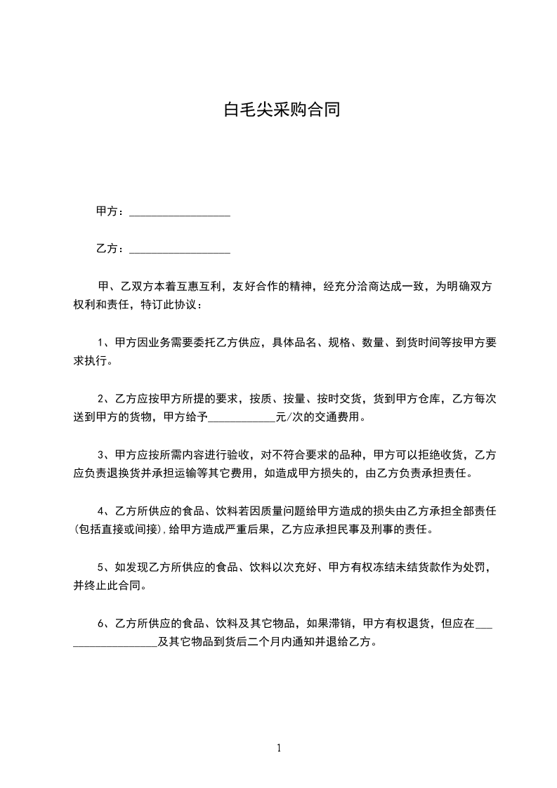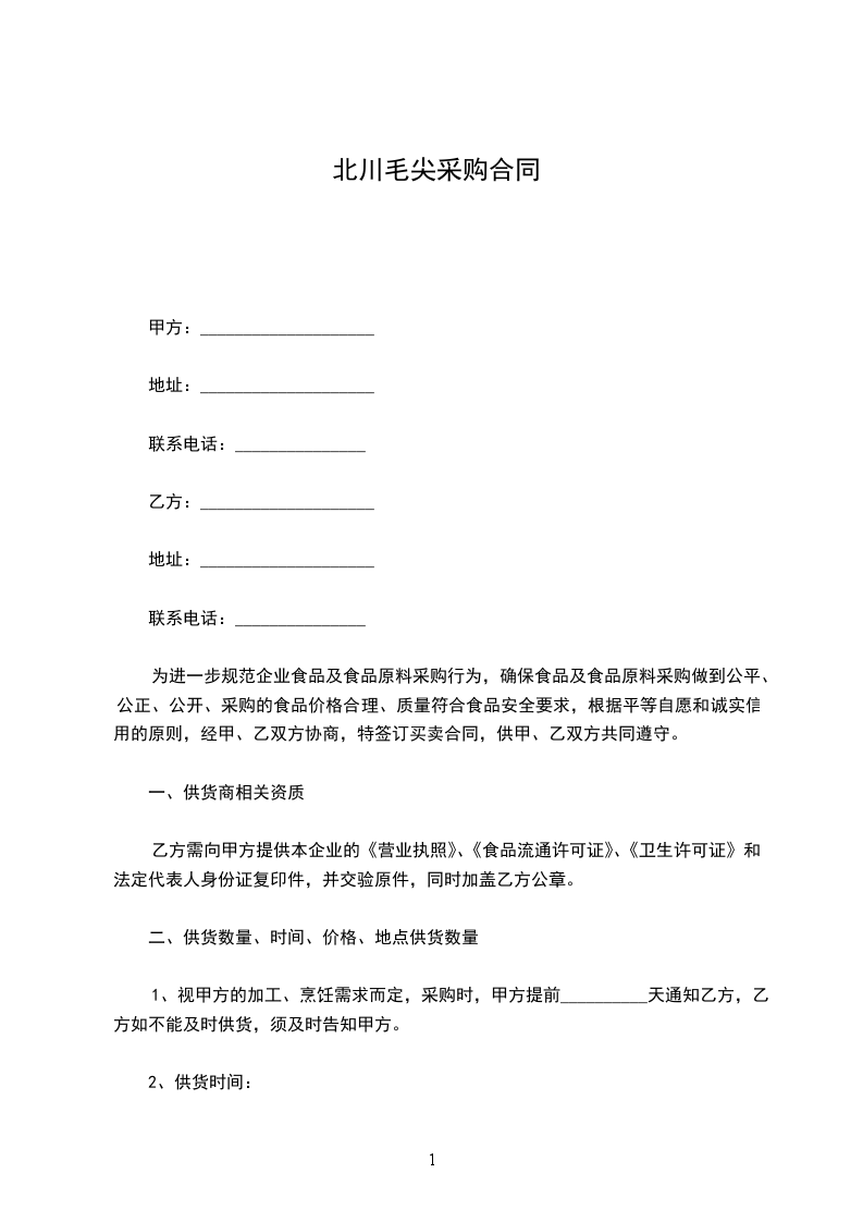 1、视甲方的加工、烹饪需求而定,采购时,甲方提前__________天通知乙方,乙方如不能及时供货,须及时告知甲方。