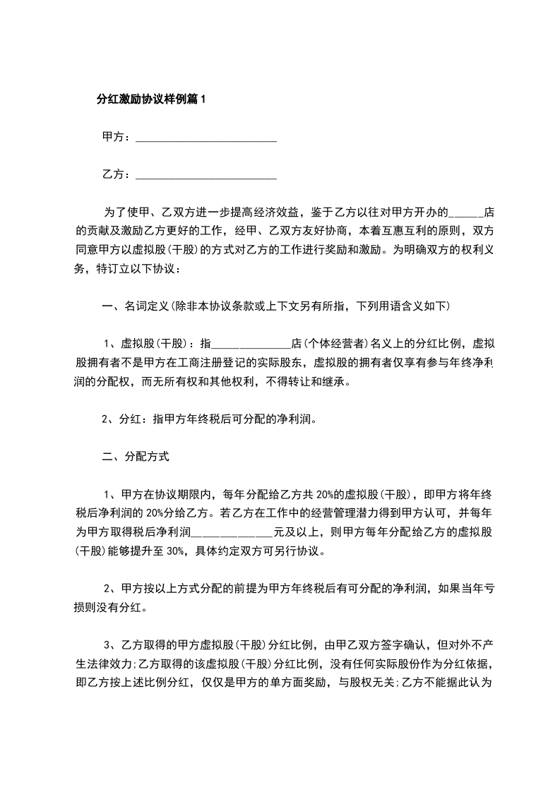 1、在公司经营活动中所得利润扣除各项开支,仍得以盈利的前提下,甲方从当年纯盈利中抽取 %作为乙方分红奖励。