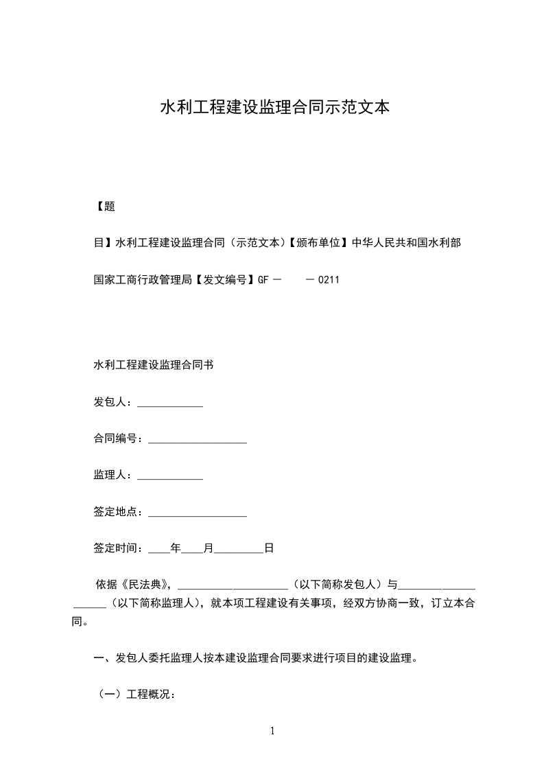 说明 为进一步规范水利建设监理市场秩序,提高建设监理水平,保障监理合同双方的合法权益,依据 等法律法规和水利工程建设监理有关规定,结合现阶段我国水利工程建设监理实际,水利部组织修订了水利工程建设监理合同示.本,并与国家工商行政管理总局联合颁发。为体现合同文本名称与其适用范围和相关内容的协调全都,本次修订将原名称“水利工程建设监理合同示.本”改为“水利工程施工监理合同示.本”(以下简称合同文本)。本次修订着重修改了托付人和监理人的权利和义务条款,进一步规范了托付人、监理人职责和合同履行中有关问题的处理方式。修订后的合同文本将有利 规范当事人双方履行合同的行为,避开因合同条款不完备、不精准等缘由产生合同纠纷。合同文本包括“监理合同书”、“通用合同条款”、“专用合同条款”、“ ”四个部分。水利工程建设监理规定(水利部令第28号)规定必需实行施工监理的水利工程建设项目(不包括水土保持工程)应当用法本合同文本,其他可参照用法。在用法本合同文本时,“监理合同书”应由托付人与监理人公平协商全都后签署;“通用合同条款”、“专用合同条款”是一个有机整体,“通用合同条款”不得修改,“专用合同条款”是针对具体工程项目特定条件对“通用合同条款”的补充和具体说明,应依据工程监理实际状况进行修改和补充;“ ”所列监理服务的工作内容及相关要求,供托付人和监理人签订合同时参考。 水利工程施工监理合同书 托付人:_监理人:_合同编号:_合同名称:_ 依据国家有关法律、法规,(托付人名称)_(以下简称托付人),托付(监理人名称)_(以下简称监理人)供应(工程名称)_工程(监理项目名称)监理服务,经双方协商全都,订立本合同。