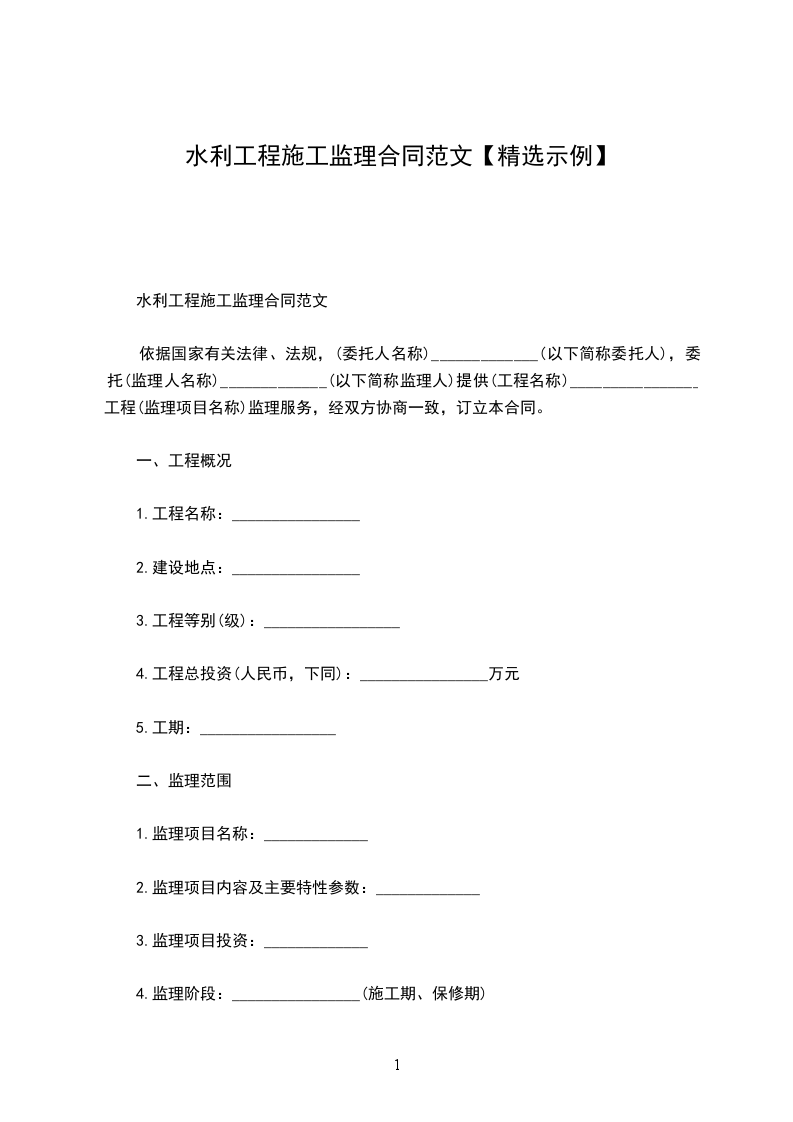 二、监理范围1监理项目名称:_2监理项目内容及主要特性参数:_3监理项目投资:_4监理阶段:_(施工期、保修期)