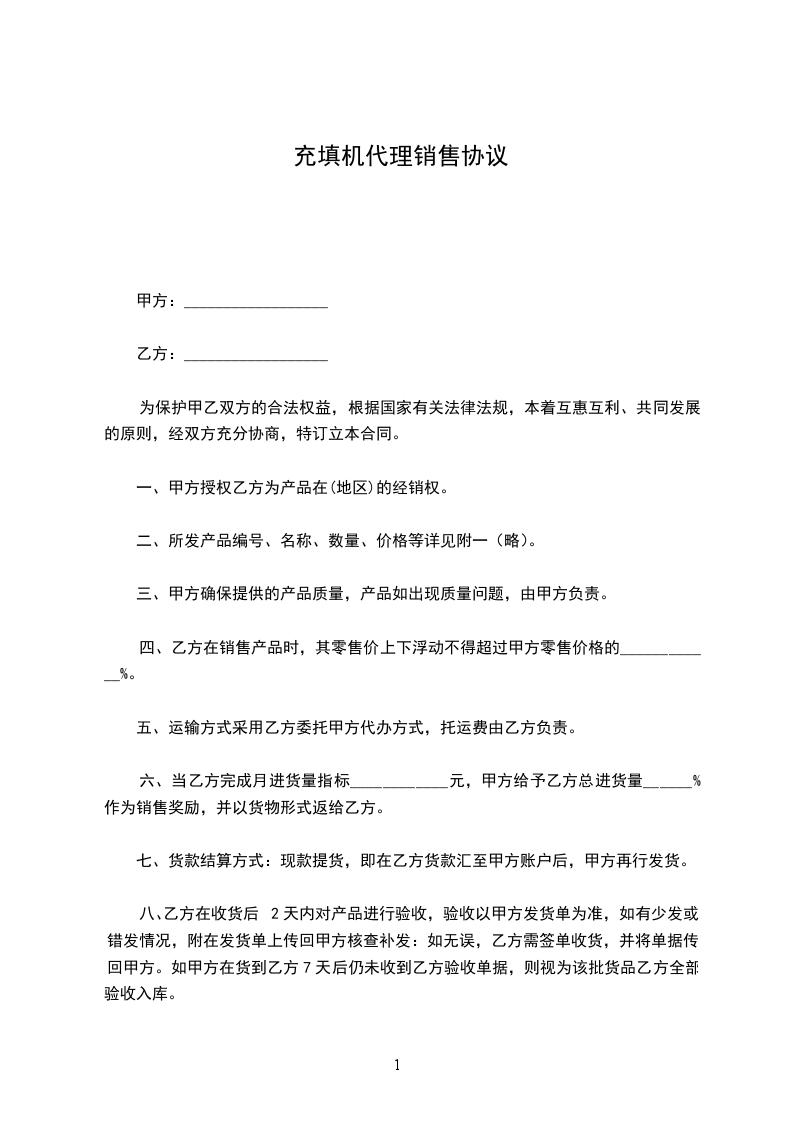 充填机代理销售协议