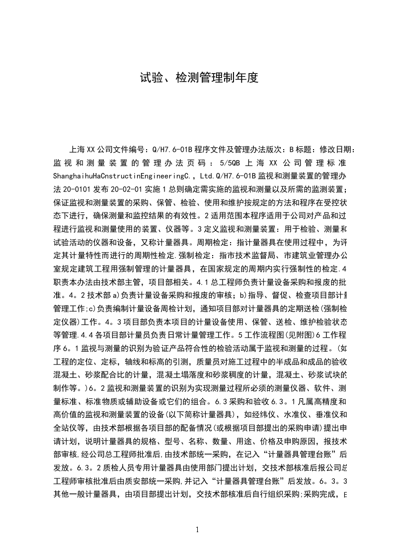 上海XX公司文件编号:Q/H7.6-01B程序文件及管理办法版次:B标题:修改日期:监视和测量装置的管理办法页码:5/5QB上海XX公司管理标准ShanghaihuHaCnstructinEngineeringC.,Ltd.Q/H7.6-01B监视和测量装置的管理办法20-0101发布20-02-01实施1总则确定需实施的监视和测量以及所需的监测装置;保证监视和测量装置的采购、保管、检验、使用和维护按规定的方法和程序在受控状态下进行,确保测量和监控结果的有效性。2适用范围本程序适用于公司对产品和过程进行监视和测量使用的装置、仪器等。3定义监视和测量装置:用于检验、测量和试验活动的仪器和设备,又称计量器具。周期检定:指计量器具在使用过程中,为评定其计量特性而进行的周期性检定.强制检定:指市技术监督局、市建筑业管理办公室规定建筑工程用强制管理的计量器具,在国家规定的周期内实行强制性的检定.4职责本办法由技术部主管,项目部相关。4.1总工程师负责计量设备采购和报废的批准。4。2技术部a)负责计量设备采购和报废的审核;b)指导、督促、检查项目部计量管理工作;c)负责编制计量设备周检计划,通知项目部对计量器具的定期送检(强制检定仪器)工作。4。3项目部负责本项目的计量设备使用、保管、送检、维护检验状态等管理.4.4各项目部计量员负责日常计量管理工作。5工作流程图(见附图)6工作程序6。1监视与测量的识别为验证产品符合性的检验活动属于监视和测量的过程。(如工程的定位、定标,轴线和标高的引测,质量员对施工过程中的半成品和成品的验收,混凝土、砂浆配合比的计量,混凝土塌落度和砂浆稠度的计量,混凝土、砂浆试块的制作等。)6。2监视和测量装置的识别为实现测量过程所必须的测量仪器、软件、测量标准、标准物质或辅助设备或它们的组合。6.3采购和验收6.3。1凡属高精度和高价值的监视和测量装置的设备(以下简称计量器具),如经纬仪、水准仪、垂准仪和全站仪等,由技术部根据各项目部的配备情况(或根据项目部提出的采购申请)提出申请计划,说明计量器具的规格、型号、名称、数量、用途、价格及申购原因,报技术部审核,经公司总工程师批准后,由技术部统一采购,在记入“计量器具管理台账”后发放。6.3。2质检人员专用计量器具由使用部门提出计划,交技术部核准后报公司总工程师审核批准后由质安部统一采购,并记入“计量器具管理台账”后发放。6。3。3其他一般计量器具,由项目部提出计划,交技术部核准后自行组织采购;采购完成,由项目部计量员记入“计量器具台账”后发放,并将相关资料交质安部记入“计量器具管理台账”.6。3。4凡采购的计量器具应符合法定计量单位,必须要有国家技术监督局规定的质量合格标签“CMC”。技术部对计量器具供应商进行评价选择(包括对资质、经营范围、质量、服务等)。6。3。5所采购的计量器具应由技术部或项目部计量员进行验收,收取各种原始凭证与资料,验收合格建立台账后方能发放使用,并办理财务报销。如验收不合格,则退货或调换。6。3。6计量器具在运输和搬运中应采取保护措施、保持准确度和使用性能完好。6.4计量器具的检定6.4。1具有“CMC”标签及有效期内的合格证(或在有效期内的检定合格证书)的计量器具,可免检,建立台账后发放使用。6。4。2凡购入的计量器具虽有“CMC标签及合格证,但出厂时间超过有效期(或该器具的检定周期)的,应先进行送检,初验合格后建立台账方能发放使用。如初验不合格,则退货或调换。6。4.3计量器具发放使用前,由计量员进行编号,并在合格的计量器具上贴上注明检定有效期的合格标签,以便使用者了解。6。5计量器具的保管6。5。1计量器具由技术部或项目部计量管理人员精心保管,有适宜的环境放置以防锈蚀和损坏;各类计量器具应在专用货架上分类堆放。6。5。2凡封存的计量器具应贴上“封存”标签,单独存放。报废的计量器具应贴上“报废标签,另行堆放及时处理,不得上架。6。6计量器具发放领用6.6。1对于经纬仪、水准仪等高精度及质检人员专用计量器具,各项目部根据规定的精密度要求和具体需要向技术部提出书面申请,经技术部审核、报总工程师审批后,填制“计量器具领用登记表后,由技术部统一发放并记入“计量器具台账”。6.6.2凡发放的计量器具必须有统一编号和合格标签,标签内应明确合格有效期;严禁未经检定或超期的计量器具使用。6。6.3封存的计量器具未经质安部计量管理人员同意不得启用发放,启封时不管是否超过检定周期均应送检合格后,方可发放使用。6。7计量器具的使用和维护6。7。1使用中的计量器具项目部必须有专人精心保管,定点妥善存放,并应按计量器具使用维护及保养制度的要求认真进行日常维护保养工作;在监视和测量时,应有适宜的环境条件,如防止日晒雨淋、灰尘、撞击等。6。7.2使用中的计量器具,应确保其测量不确定度已知,并与要求的测量能力一致,一经发现器具损坏,精度降低等,应停止使用,立即由项目工程师评定已监视和测量结果的有效性,并记入有关文件;同时将计量器具送交技术部,并填制“计量器具调换申请表”,其中应写明损坏或精度降低前所测试内容及对测试结果有效性的评定,经质安部计量管理人员同意后进行调换。失准计量器具由技术部送计量检测部门修理、检定,经检验合格后方可投入使用。6.7.3对于