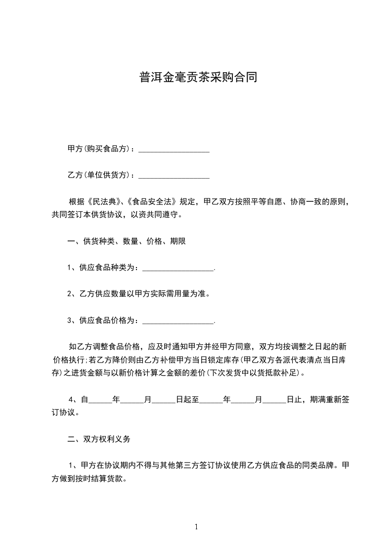 为保证食品安全,规范食品经营行为,增强供需双方的食品安全责任意识,提高供需双方的诚信意识。甲方与乙方经友好协商,签署如下协议: