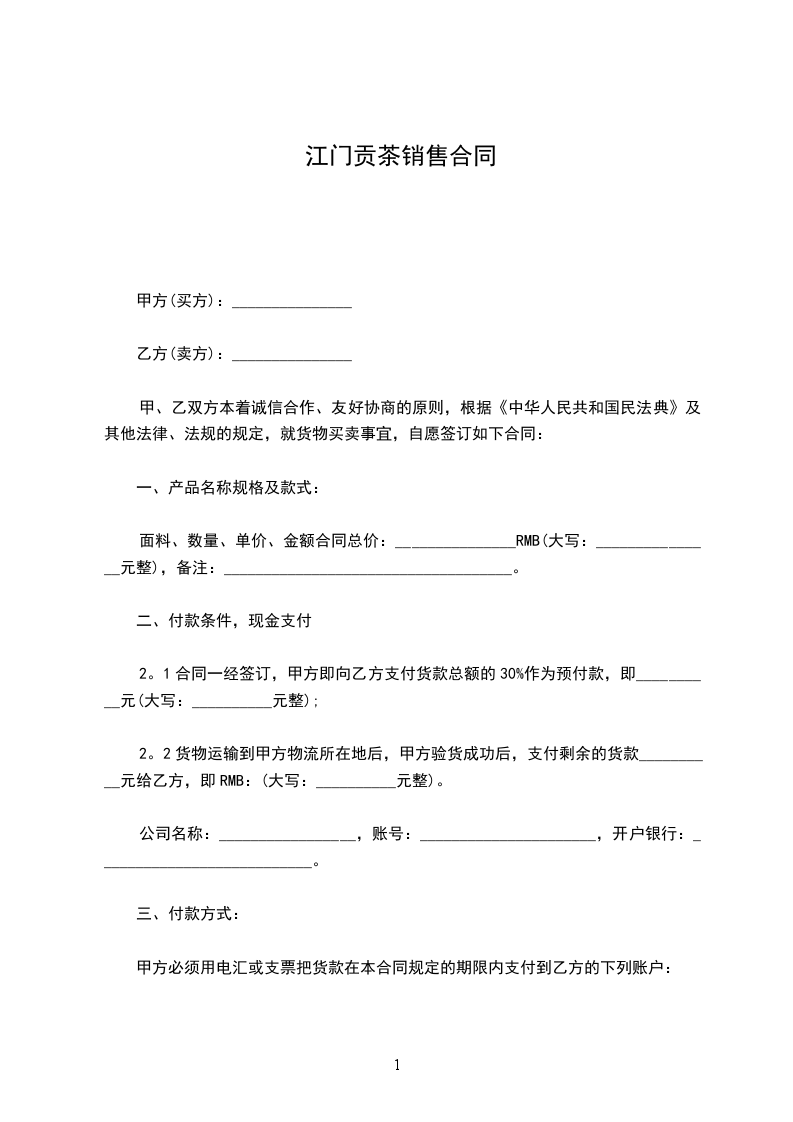 江头贡茶销售合同