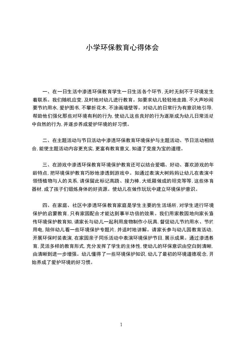 四、在家庭、社区中渗透环保教育家庭是学生主要的生活场所,对学生进行环境保护的启蒙教育,只有家园配合才能达到事半功倍的效果。我们用家教园地向家长宣传环境保护教育知,请家长与幼儿一起利用废物制作小玩具,督促幼儿节约用水、节约用电,陪伴幼儿看一些环境保护专题片,并适时地讲解。请家长参与幼儿园教育活动,开展环保时装表演,在家园亲子同乐活动中表演环境保护节目,展示成果。通过渗透教育,灵活多样的教育形式,充分发挥了学生的主体性,使幼儿的环保意识由空白到清晰,由清晰到进一步增强。幼儿懂得了一些环境保护知识,幼儿了最初的环境道德观念,开始养成了爱护环境的好习惯。