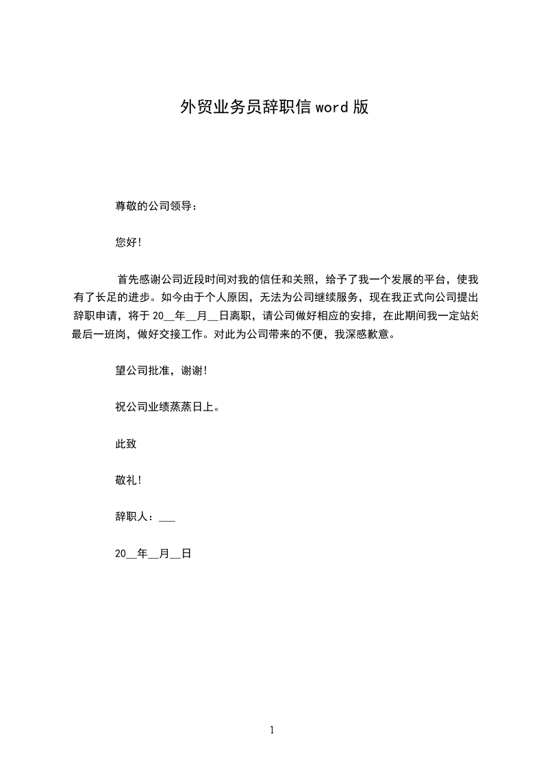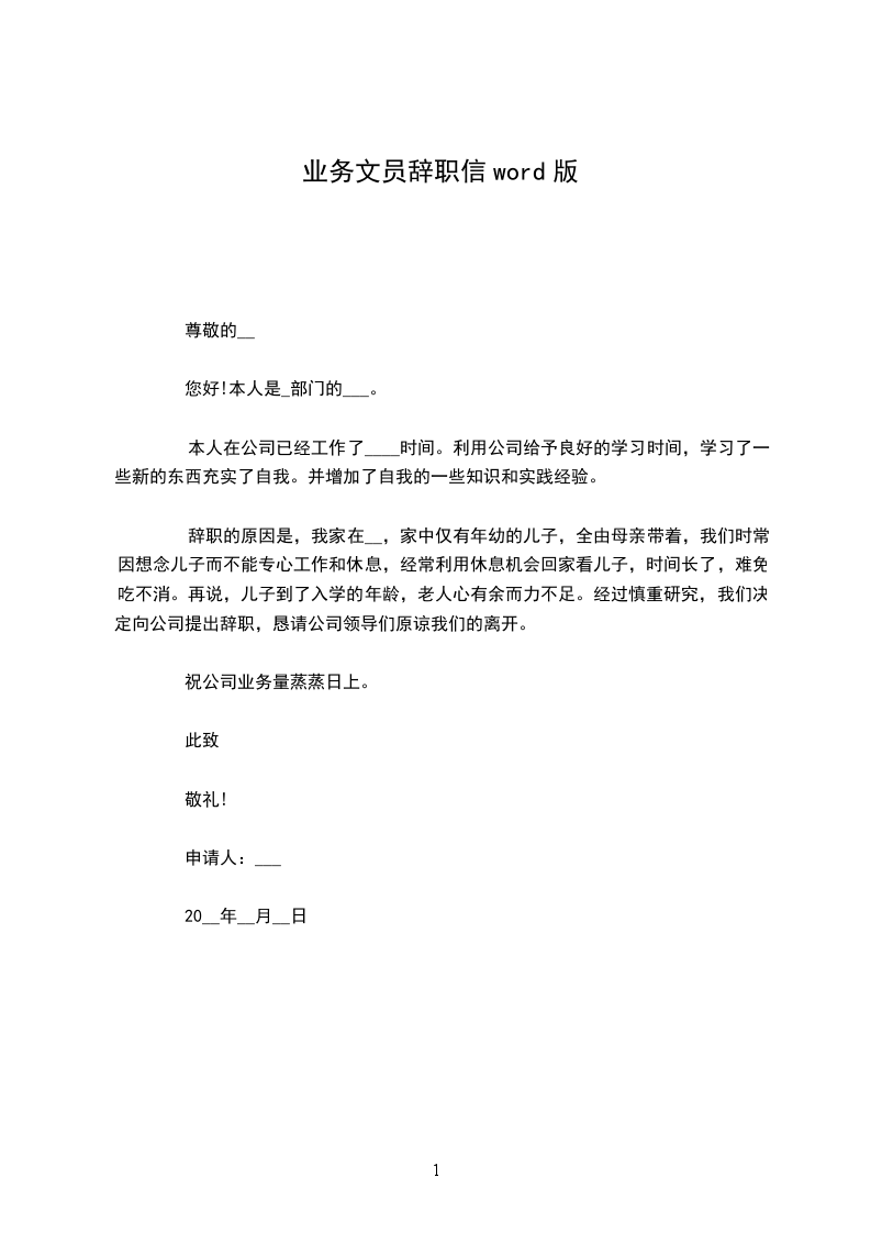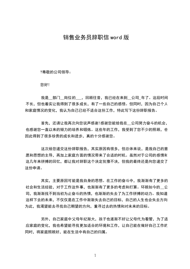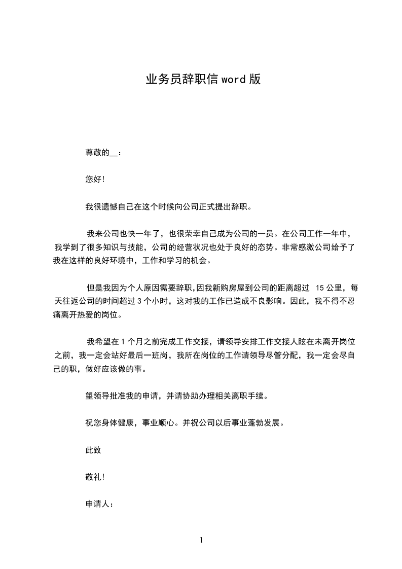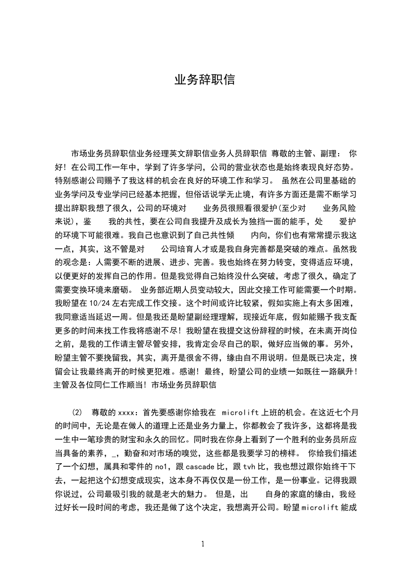 (2) 尊敬的xxxx: 首先要感谢你给我在microlift上班的机会。在这近七个月的时间中,无论是在做人的道理上还是业务力量上,你都教会了我许多,这都将是我一生中一笔珍贵的财宝和永久的回忆。同时我在你身上看到了一个胜利的业务员所应当具备的素养,_,勤奋和对市场的嗅觉,这些都是我要学习的榜样。 你给我们描述了一个幻想,属具和零件的no1,跟cascade比,跟tvh比,我也想过跟你始终干下去,一起把这个幻想变成现实,这本身不再仅仅是一份工作,是一份事业。记得我跟你说过,公司最吸引我的就是老大的魅力。 但是,出 自身的家庭的缘由,我经过好长一段时间的考虑,我还是做了这个决定,我想离开公司。盼望microlift能成为属具和零件的no1,也盼望我也能找到一条更适合我的路。 此致 敬礼! 辞职人: 时间: xxx年x月x日 业务经理英文辞职信