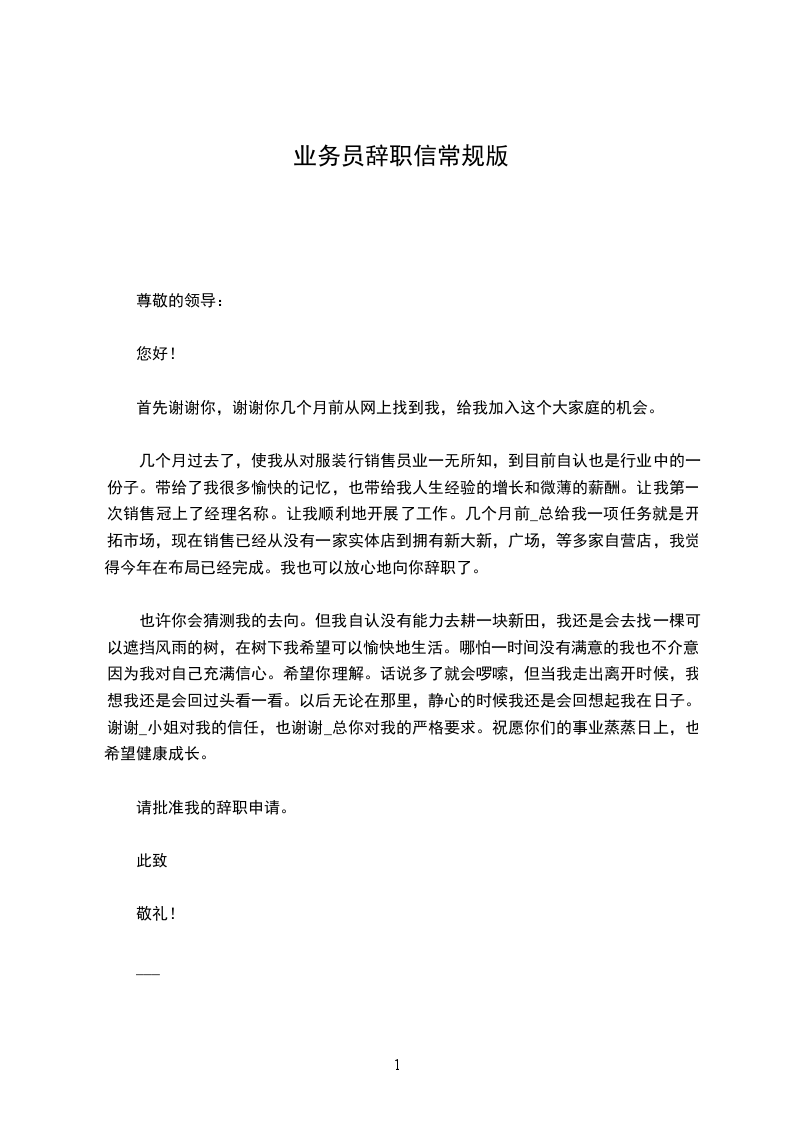 市场业务员辞职信业务经理英文辞职信业务人员辞职信 尊敬的主管、副理: 你好! 在公司工作一年中,学到了许多学问,公司的营业状态也是始终表现良好态势。特别感谢公司赐予了我这样的机会在良好的环境工作和学习。 虽然在公司里基础的业务学问及专业学问已经基本把握,但俗话说学无止境,有许多方面还是需不断学习。提出辞职我想了很久,公司的环境对 业务员很照看很爱护(至少对 业务风险来说),鉴 我的共性,要在公司自我提升及成长为独挡一面的能手,处 爱护的环境下可能很难。我自己也意识到了自己共性倾 内向,你们也有常常提示我这一点,其实,这不管是对 公司培育人才或是我自身完善都是突破的难点。虽然我的观念是:人需要不断的进展、进步、完善。我也始终在努力转变,变得适应环境,以便更好的发挥自己的作用。但是我觉得自己始终没什么突破,考虑了很久,确定了需要变换环境来磨砺。 业务部近期人员变动较大,因此交接工作可能需要一个时期。我盼望在10/24左右完成工作交接。这个时间或许比较紧,假如实施上有太多困难,我同意适当延迟一周。但是我还是盼望副经理理解,现接近年底,假如能赐予我支配更多的时间来找工作我将感谢不尽! 我盼望在我提交这份辞程的时候,在未离开岗位之前,是我的工作请主管尽管安排,我肯定会尽自己的职,做好应当做的事。另外,盼望主管不要挽留我,其实,离开是很舍不得,缘由自不用说明。但是既已决定,挽留会让我最终离开的时候更犯难。感谢! 最终,盼望公司的业绩一如既往一路飙升!主管及各位同仁工作顺当! 市场业务员辞职信