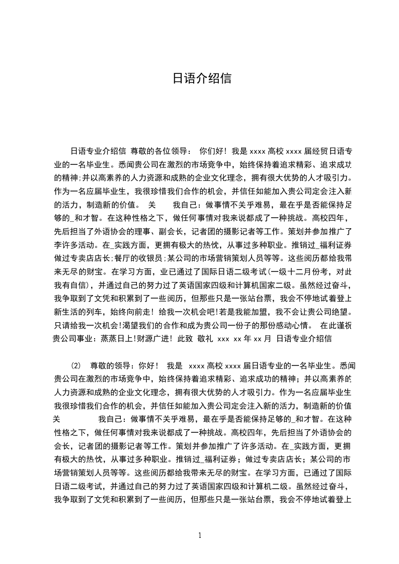 日语专业介绍信 尊敬的各位领导: 你们好! 我是xxxx高校xxxx届经贸日语专业的一名毕业生。悉闻贵公司在激烈的市场竞争中,始终保持着追求精彩、追求成功的精神;并以高素养的人力资源和成熟的企业文化理念,拥有很大优势的人才吸引力。作为一名应届毕业生,我很珍惜我们合作的机会,并信任如能加入贵公司定会注入新的活力,制造新的价值。 关 我自己:做事情不关乎难易,最在乎是否能保持足够的_和才智。在这种性格之下,做任何事情对我来说都成了一种挑战。高校四年,先后担当了外语协会的理事、副会长,记者团的摄影记者等工作。策划并参加推广了李许多活动。在_实践方面,更拥有极大的热忱,从事过多种职业。推销过_福利证券;做过专卖店店长;餐厅的收银员;某公司的市场营销策划人员等等。这些阅历都给我带来无尽的财宝。在学习方面,业已通过了国际日语二级考试(一级十二月份考,对此我有自信),并通过自己的努力过了英语国家四级和计算机国家二级。虽然经过奋斗,我争取到了文凭和积累到了一些阅历,但那些只是一张站台票,我会不停地试着登上新生活的列车,始终向前走! 给我一次机会吧!若是我能加盟,我不会让贵公司绝望。只请给我一次机会!渴望我们的合作和成为贵公司一份子的那份感动心情。 在此谨祝贵公司事业:蒸蒸日上!财源广进! 此致 敬礼 xxx xx年xx月 日语专业介绍信