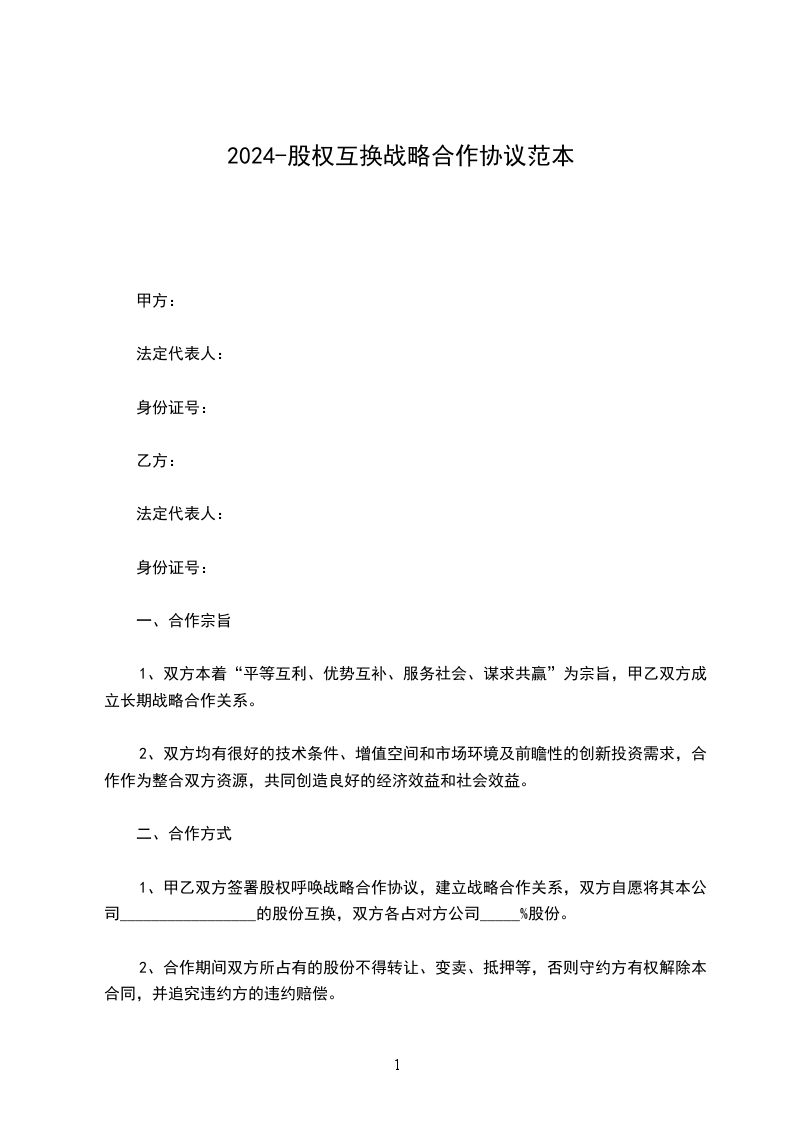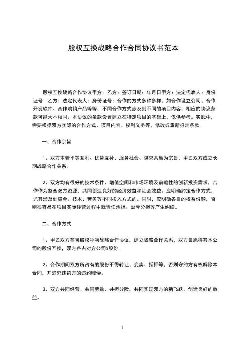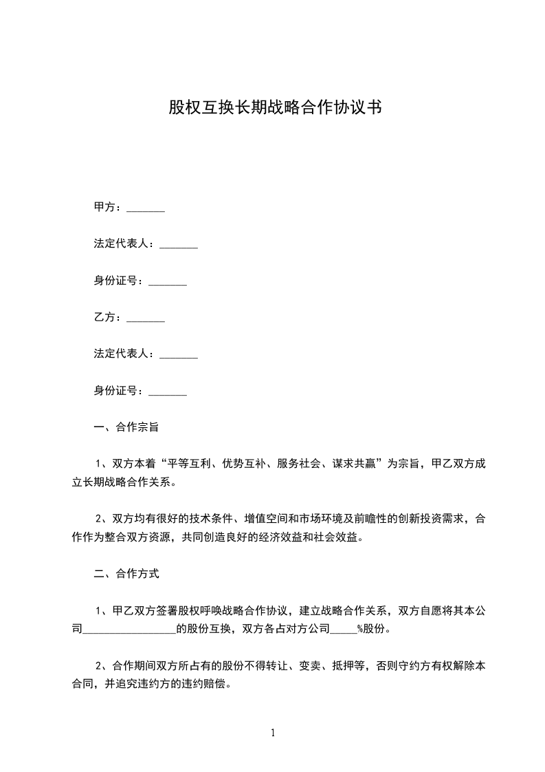 1、甲乙双方签署股权呼唤战略合作协议,建立战略合作关系,双方自愿将其本公司_________________的股份互换,双方各占对方公司_____%股份。