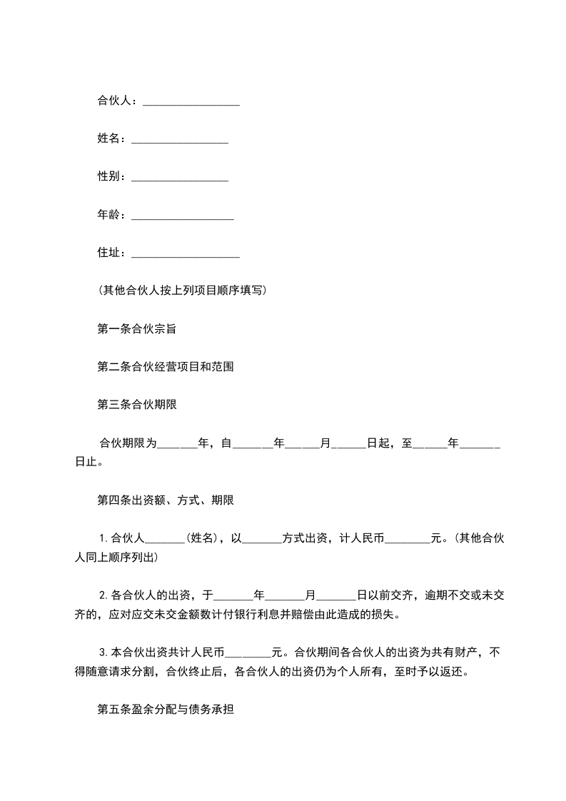 1.合伙人_______(姓名),以_______方式出资,计人民币________元。(其他合伙人同上顺序列出)
