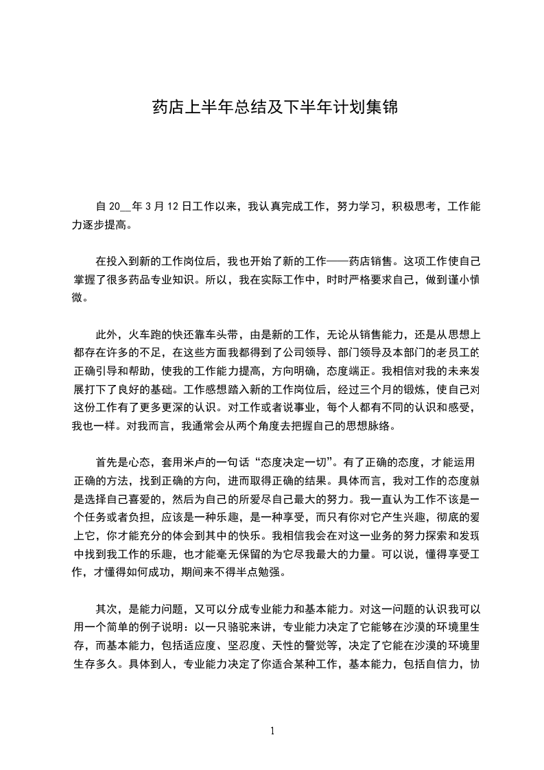 4.店容店貌:为了给顾客制造一个良好的购物环境,为公司创作更多的销售业绩,带领员工在以下几方面做好本职工作。首先,做好每天的清洁工作,为顾客营造一个舒心的购物环境;其次,主动主动的为顾客服务,尽可能的满足消费者需求;要不断强化服务意识,并以发自内心的微笑和礼貌的文明用语,使顾客满足的离开本店__年过去了这一年是布满着机遇与挑战的一年,日常工作中的每一件小事都隐藏着欢乐与美好,只要我们用欢乐的心去体会,用美好的眼去看待。什么困难和挫折都不会难倒我们的。过去的一年在领导的悉心关怀和指导下,通过我们自身的不懈努力,在工作上取得了肯定的成果,但也存在了诸多不足,需要连续改正!在新的一年中,我信任药店的生意会越来越好的,这些需要我们良好的服务和优质的药品,我信任美妙的明天就在眼前!