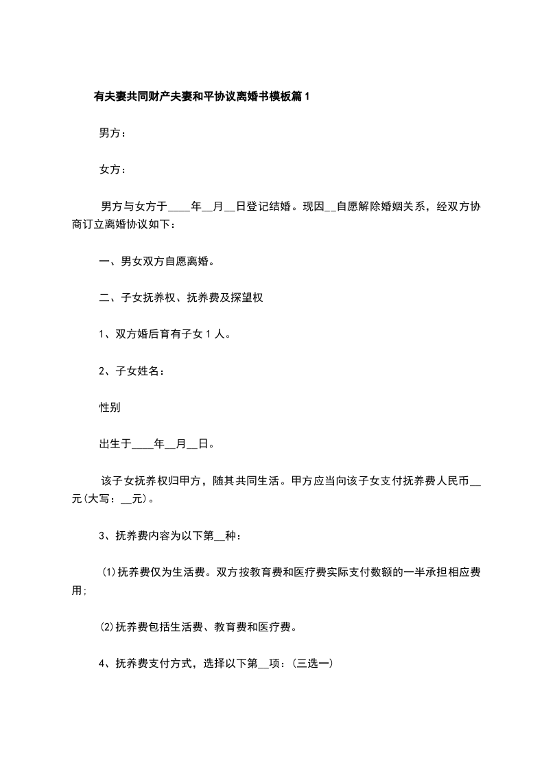 有夫妻共同财产夫妻和平离婚协议书参考样例篇1
