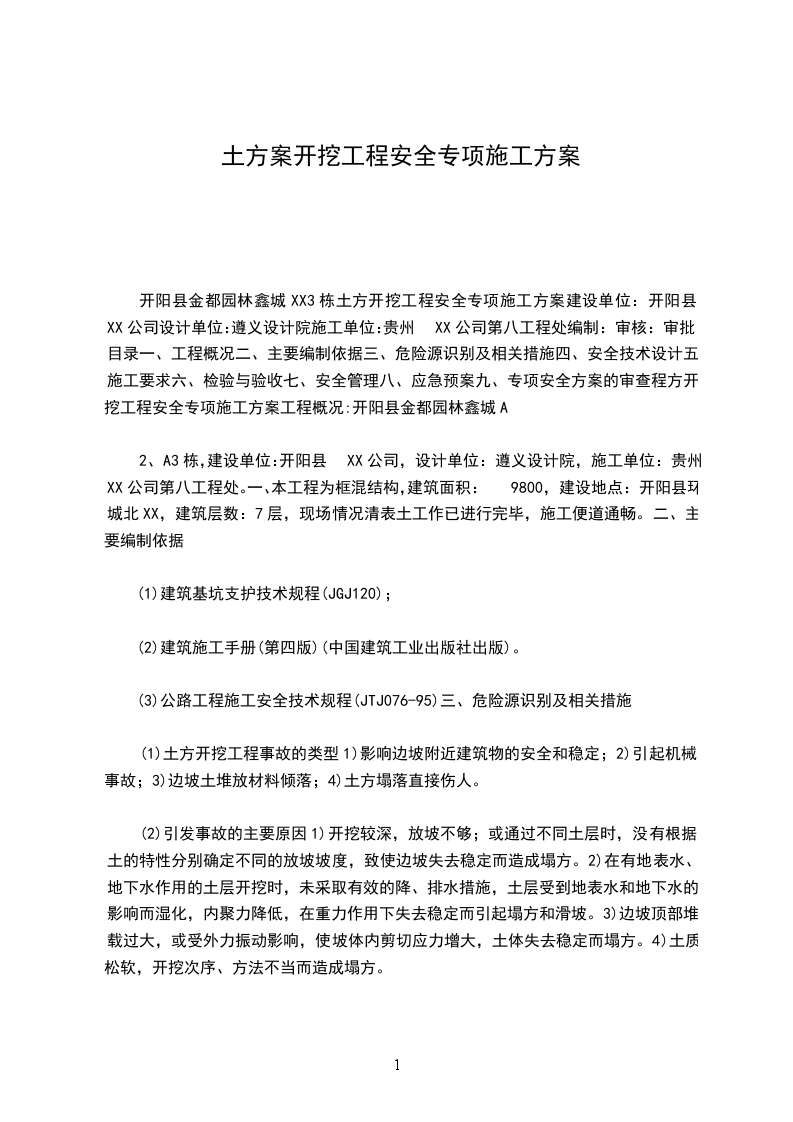 开阳县金都园林鑫城XX3栋土方开挖工程安全专项施工方案建设单位:开阳县XX公司设计单位:遵义设计院施工单位:贵州XX公司第八工程处编制:审核:审批:目录一、工程概况二、主要编制依据三、危险源识别及相关措施四、安全技术设计五、施工要求六、检验与验收七、安全管理八、应急预案九、专项安全方案的审查程方开挖工程安全专项施工方案工程概况:开阳县金都园林鑫城A