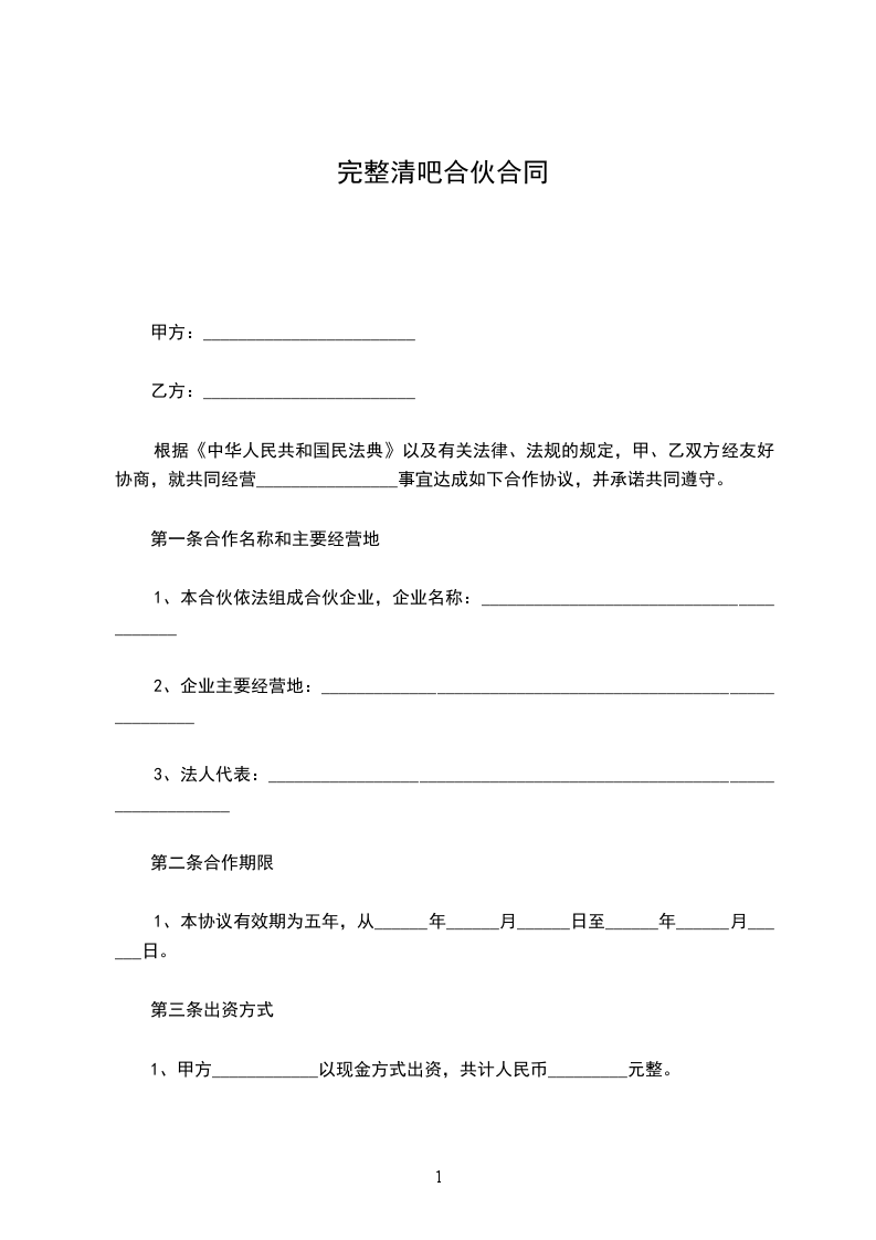 4、本合作出资共计人民币_________元整。合作期间各合伙人的出资为共有财产,不得随意请求分割,合作终止后,所有财产为各合伙人平分。
