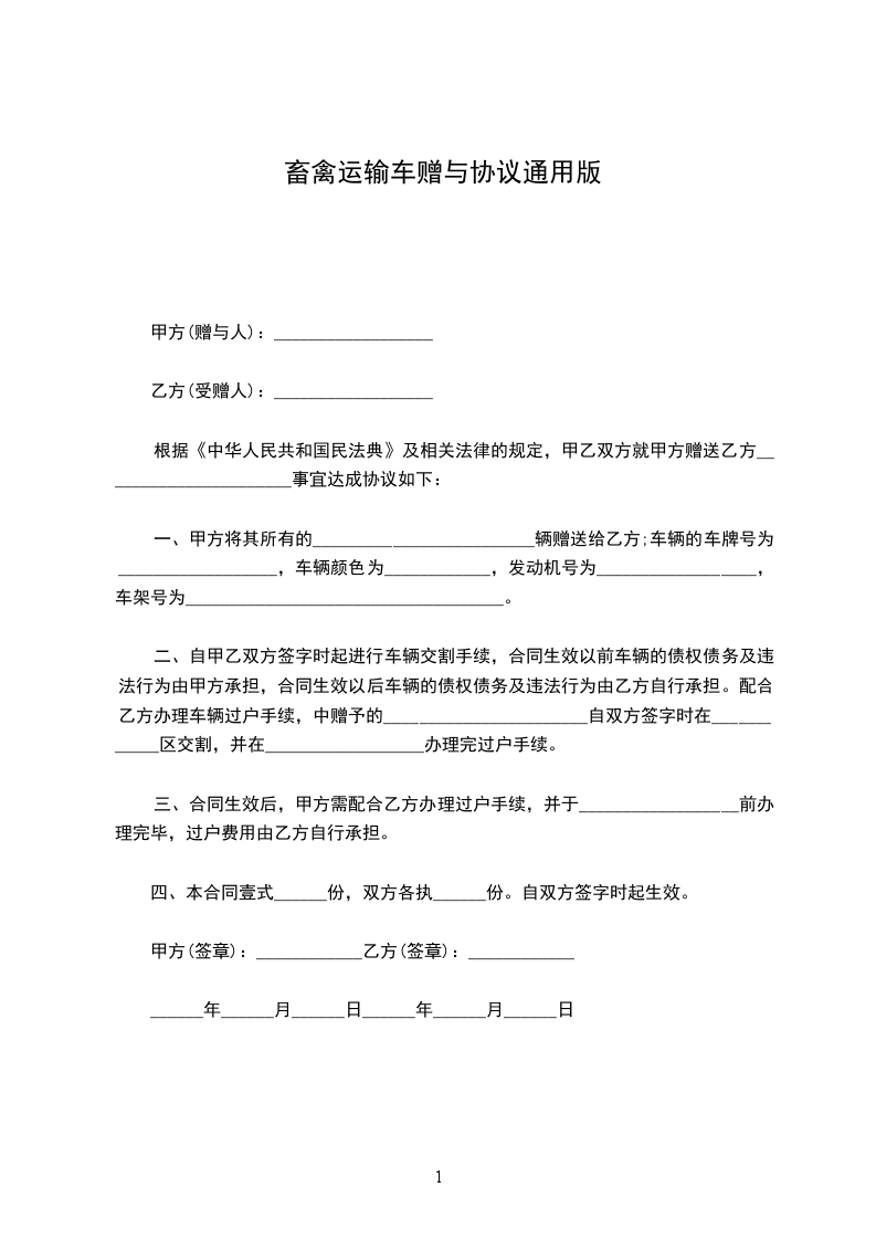 一、甲方将其所有的_________________________辆赠送给乙方;车辆的车牌号为__________________,车辆颜色为____________,发动机号为__________________,车架号为____________________________________。