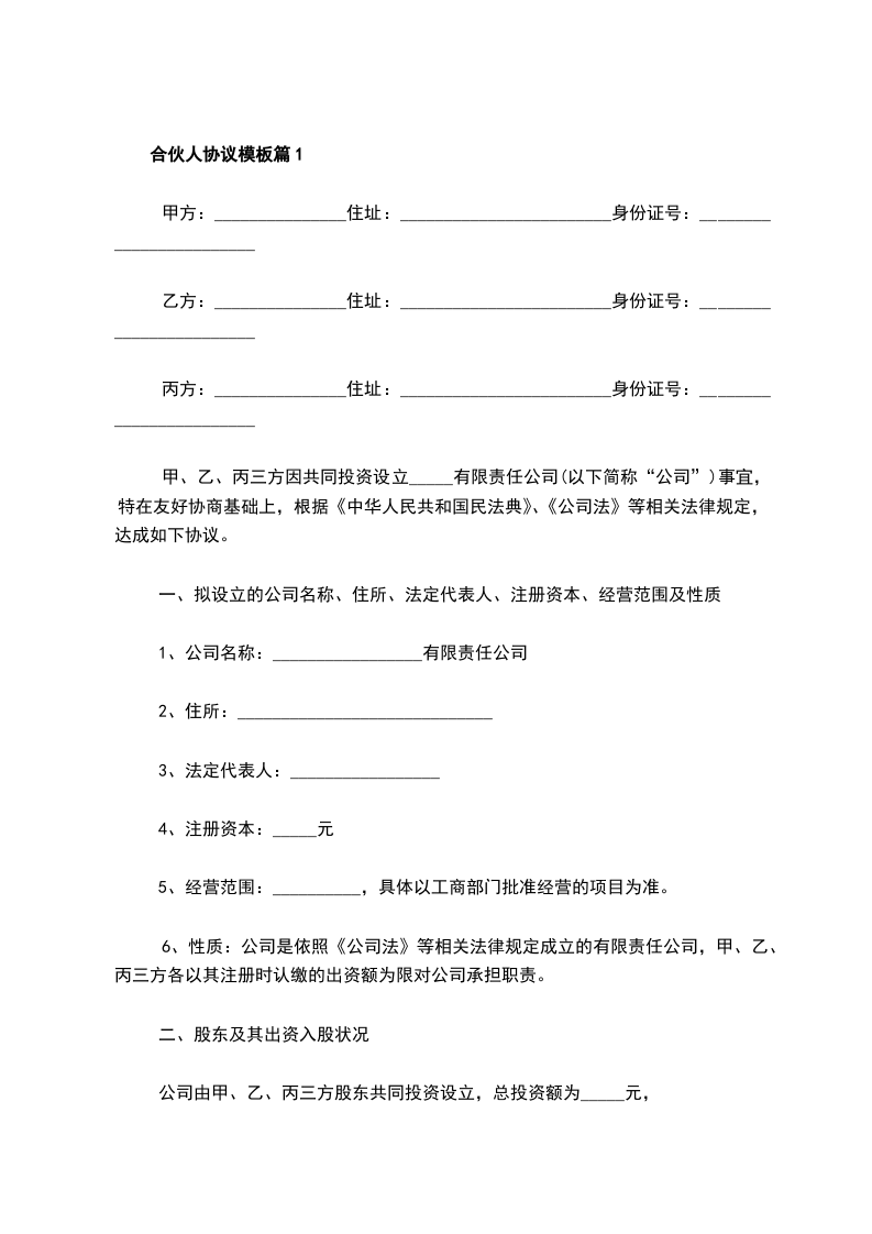 合伙人协议模板篇1
