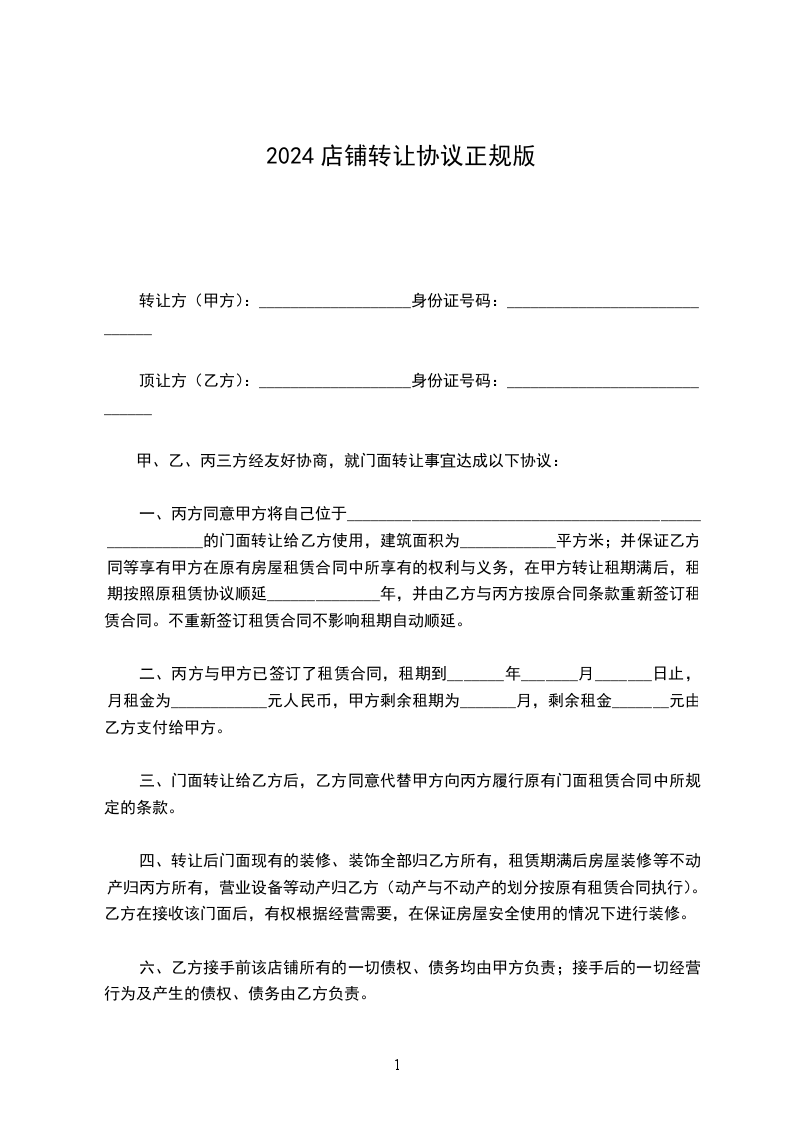 顶让方(乙方):___________________身份证号码:______________________________