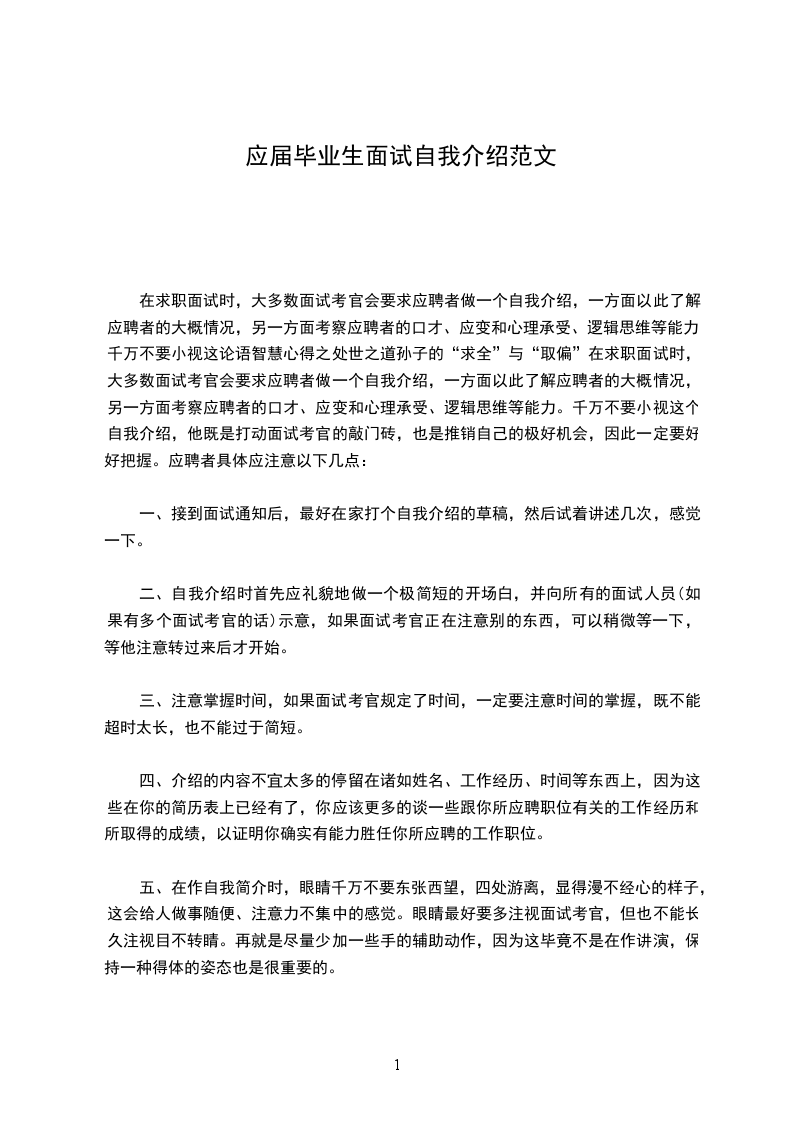 1、面试自我介绍的内容首先请报出自己的姓名和身份。可能应试者与面试考官打招呼时,已经将此告诉了对方,而且考官们完全可以从你的报名表、简历等材料中了解这些情况,但仍请你主动提及。这是礼貌的需要,还可以加深考官对你的印象。其次,你可以简单地介绍一下你的学历、工作经历等基本个人情况。请提供给考官关于你个人情况的基本的、完整的信息,如:学历、工作经历、家庭概况、兴趣爱好、理想与报负等。这部分的陈述务必简明扼要、抓住要点。例如介绍自己的学历,一般只需谈本专科以上的学历。工作单位如果多,选几个有代表性的或者你认为重要的介绍,就可以了,但这些内容一定要和面试及应考职位有关系。请保证叙述的线索清晰,一个结构混乱、内容过长的开场自,会给考官们留下杂乱无章、个性不清晰的印象,并且让考官倦怠,削弱对继续进行的面试的兴趣和注意力。应试者还要注意这部份内容应与个人简历、报名材料上的有关内容相一致,不要有出入。在介绍这些内容时,应避免书面语言的严整与拘束,而使用灵活的口头语进行组织。这些个人基本情况的介绍没有对或错的问题都属于中性问题,但如果因此而大意就不妥了。接下来由这部份个人基本情况,自然地过渡到一两个自己本科或工作期间圆满完成的事件,以这一两个例子来形象地、明晰他说明自己的经验与能力,例如:在学校担任学生干部时成功组织的活动;或者如何投入到社会实践中,利用自己的专长为社会公众服务;或者自己在专业上取得的重要成绩以及出色的学术成就。接下来要着重结合你的职业理想说明你应聘这一职位的原因,这一点相当重要。你可以谈你对应考单位或职务的认识了解,说明你选择这个单位或职务的强烈愿望。原先有工作单位的应试者应解释清楚自己放弃原来的工作而做出新的职业选择的原因。你还可以谈如果你被录取,那么你将怎样尽职尽责地工作,并不断根据需要完善和发展自己。当然这些都应密切联系你的价值观与职业观。不过,如果你将自己描述为不食人间烟火的、不计较个人利益的“圣人”,那么考官们对你的求职动机的信任,就要大打折扣了。这里我们介绍了一条清晰的线索,便于你组织你的自我介绍。为了保证结构明确,有条有理,你可以多用短句子以便于口语表述,并且在段与段之间使用过渡句子,口语也要注意思路、叙述语言的流畅,尽量避免颠三倒四,同一句话反复说几遍的“粘糊劲,同时不要用过于随便的表述。